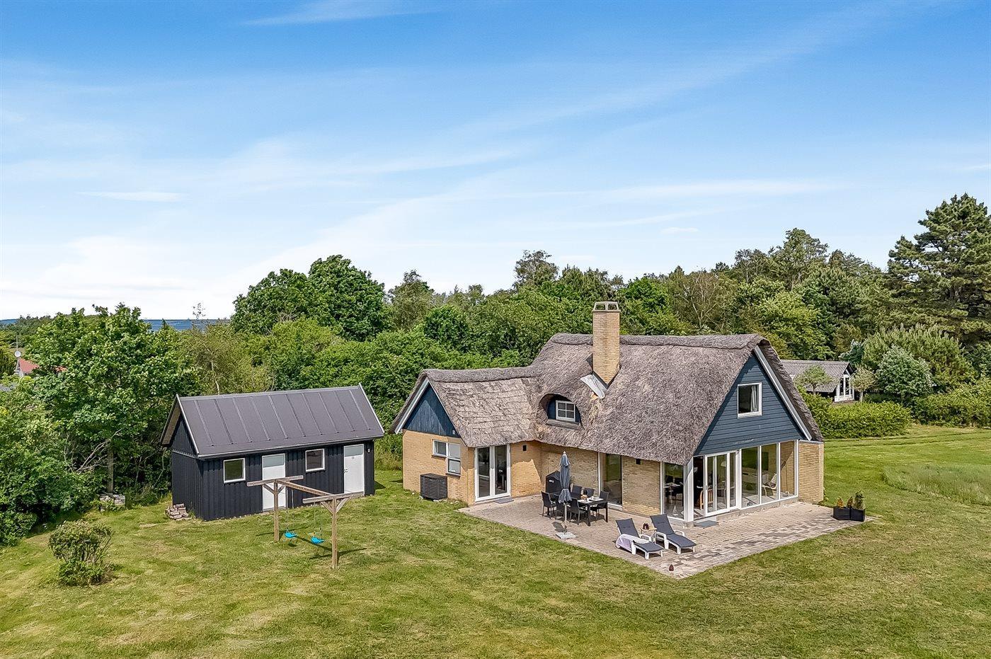 Smukt stråtækt sommerhus med panoramaudsigt og spa, kun 50 m fra havet i Knebel.