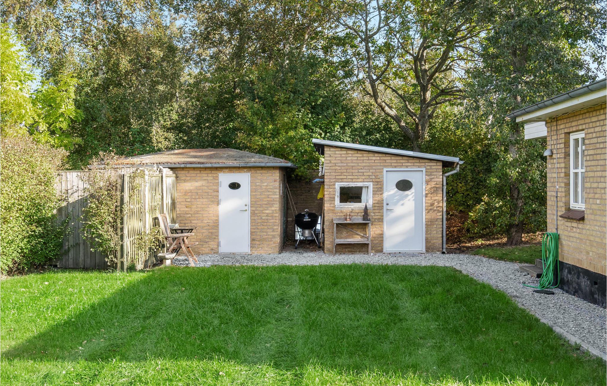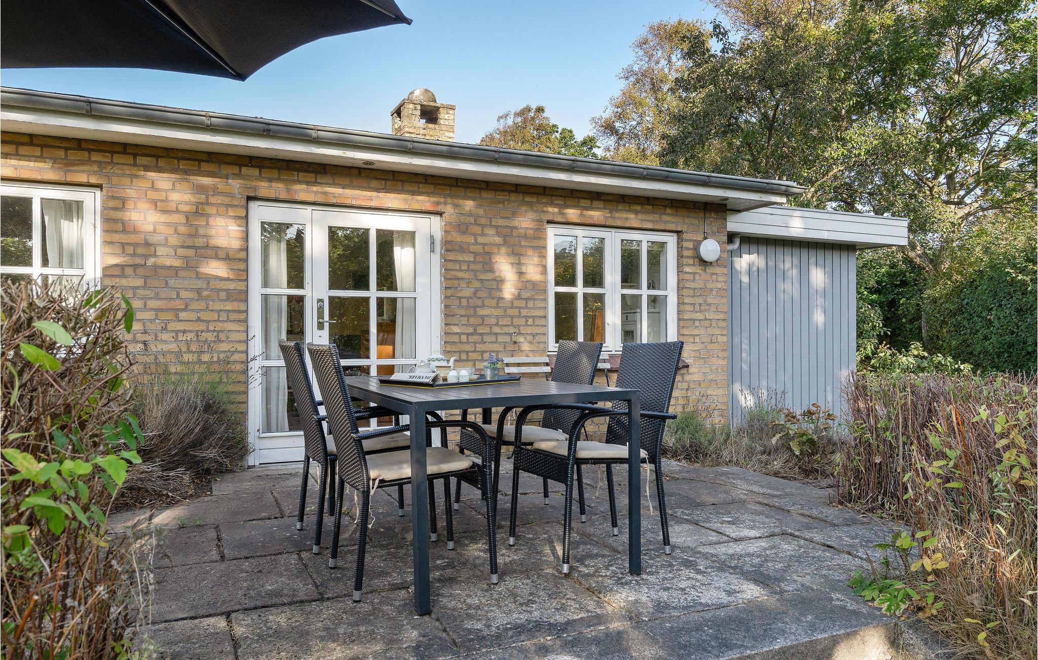 Hyggeligt gult murstenshus ved Skødshoved Strand med terrasse og natur lige udenfor døren.