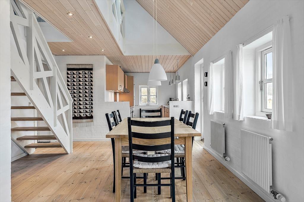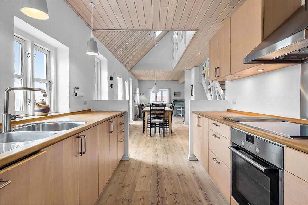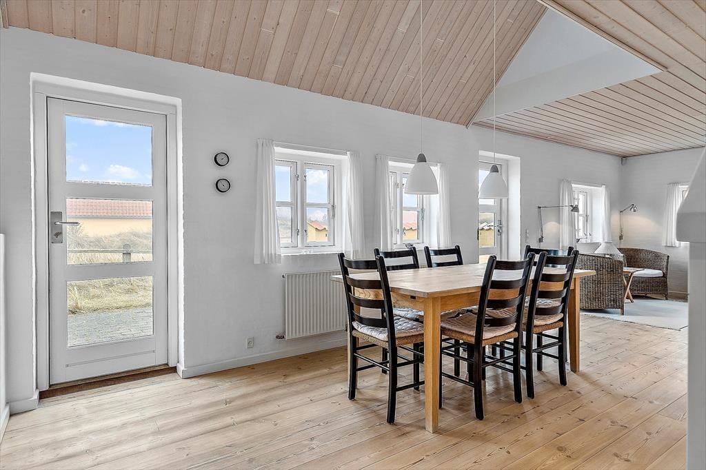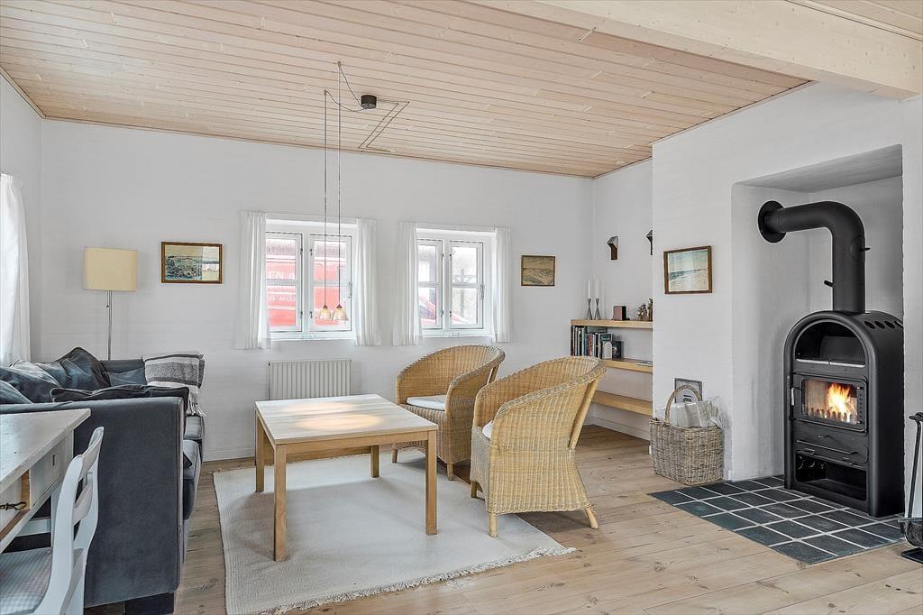 Når du træder ind i feriehuset, bliver du mødt af en indbydende atmosfære med lys og en rummelig indretning, der gør det let at slappe af. Den gennemtænkte planløsning giver plads til både samvær og hygge, og stuen bliver det naturlige samlingspunkt for familien. Her kan du nyde varmen fra brændeovnen på kølige aftener og slappe af med en god bog eller film. Køkkenet er praktisk og åbent, så du let kan være en del af samtalen, mens du forbereder måltider. Huset har også komfortable soveværelser, hvor du kan få en god nats søvn efter en lang dag ved stranden eller på opdagelse i området.
