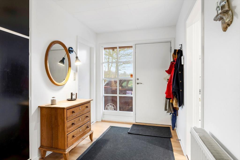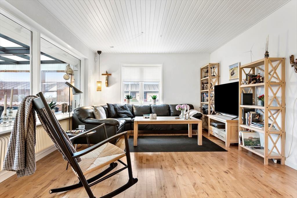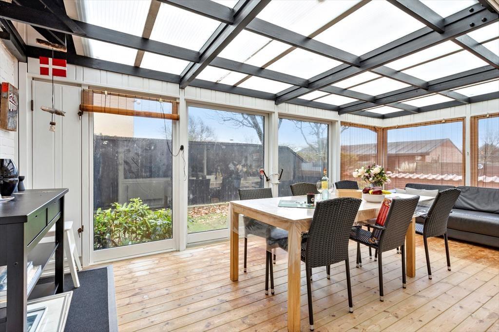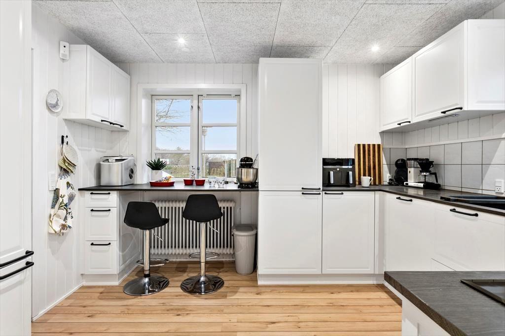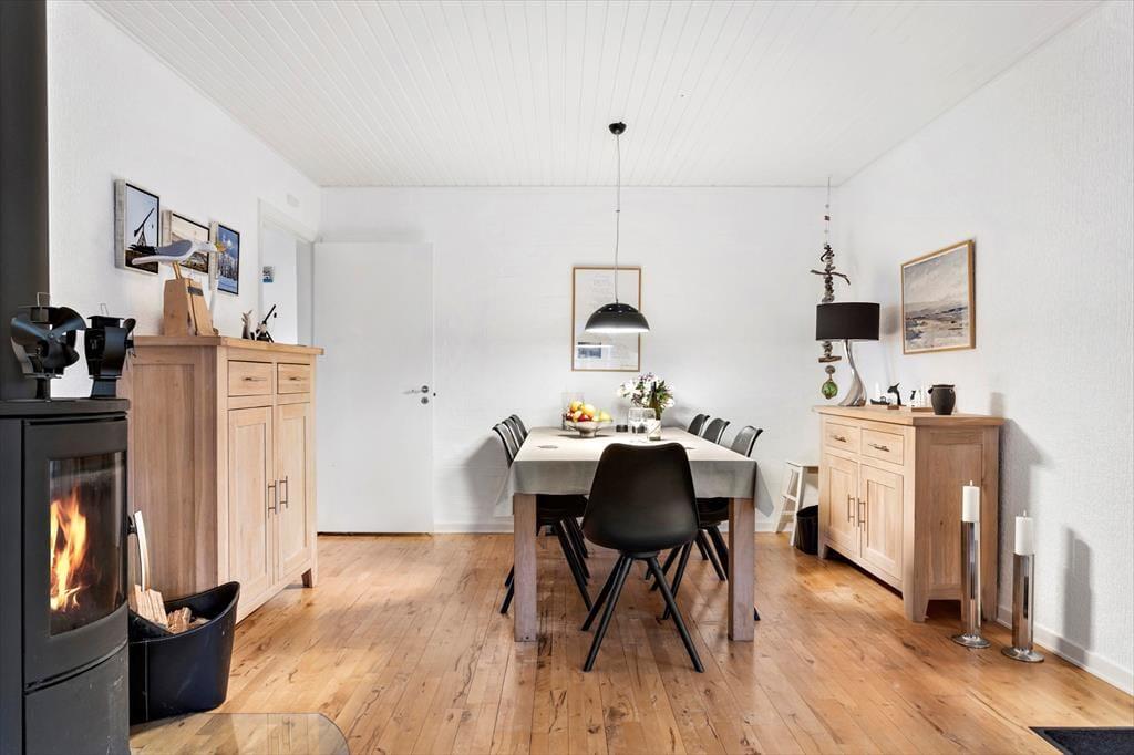 Indenfor møder du et lyst og hyggeligt indrettet sommerhus, som med sin gennemgribende renovering fremstår både indbydende og fuld af moderne komfort. Det store vinduesparti skaber en klar forbindelse mellem inde og ude, og det smukke dagslys strømmer ind i opholdsrummet, hvor brændeovnen spreder varme og stemning på de køligere dage. Den dejlige udestue bliver hurtigt et samlingspunkt – et perfekt sted til lange morgenstunder med kaffe i hånden, mens dagens ferieplaner tager form, eller til rolige aftener, hvor du kan følge solnedgangens farveskift over hustagene. Indretningen er gennemført i en let og nordisk stil, der giver ro i sindet og masser af plads til feriehyggen.