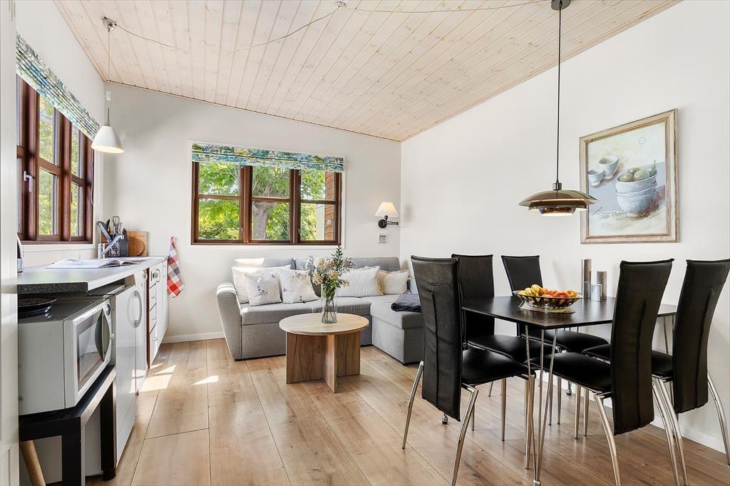 Udendørs venter jer en hyggelig og lukket gårdhave, der er som skabt til ferie. Her kan I starte dagen med en kop kaffe i solen eller tænde op i grillen og nyde aftensmaden under åben himmel. De gode lækroge gør det let at finde både sol og skygge, og den intime stemning indbyder til afslapning og nærvær. Gårdhaven er et oplagt samlingspunkt for hele familien – uanset om I spiller kort, læser bøger, leger med børnene eller bare læner jer tilbage og nyder den skagenske atmosfære.