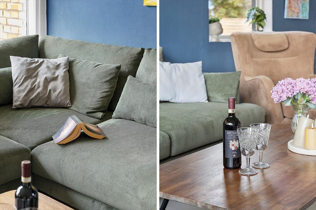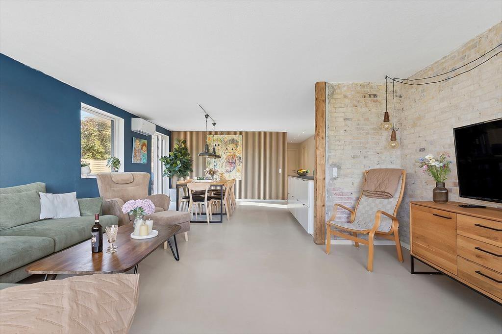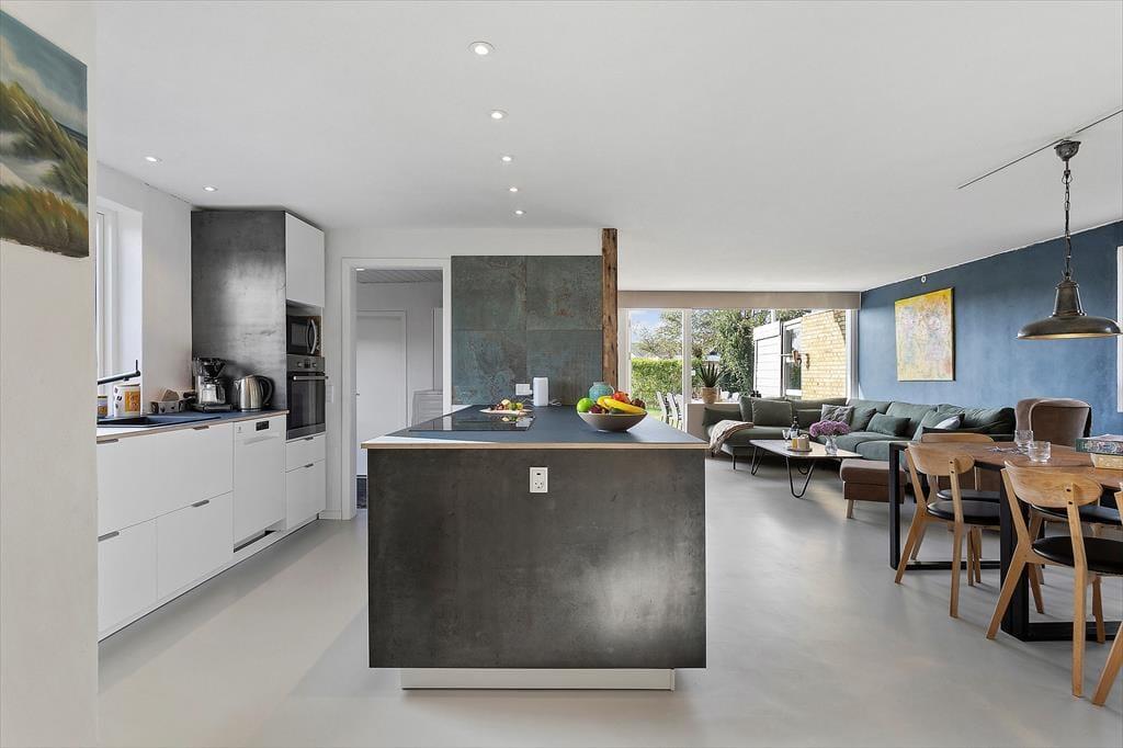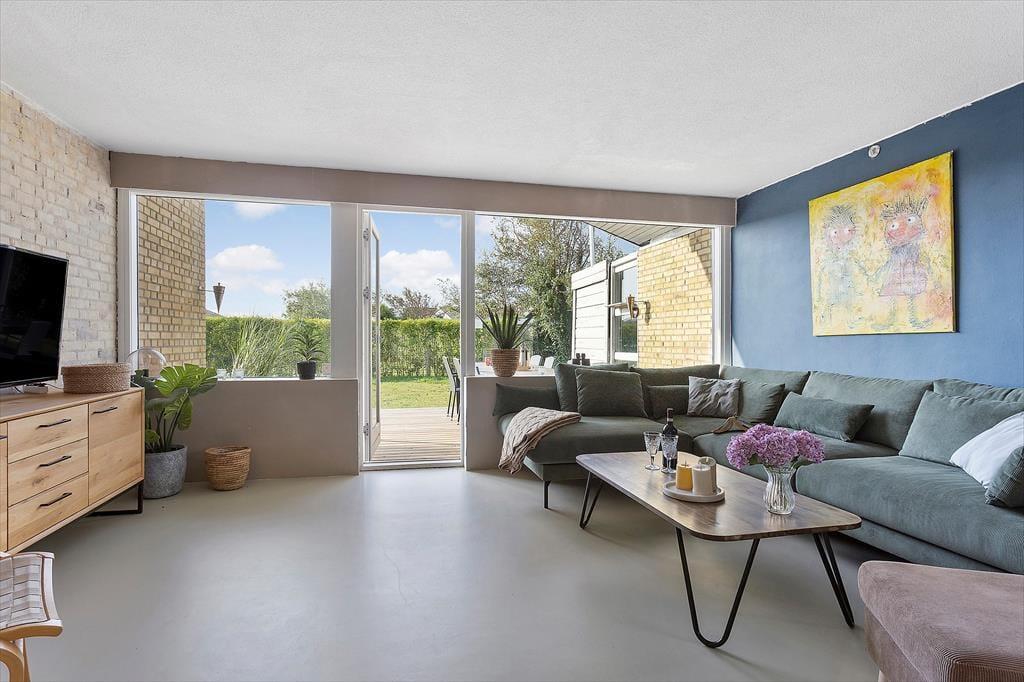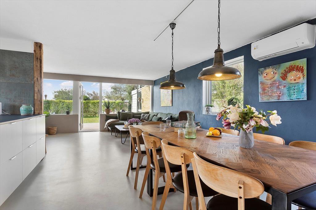 Indenfor mødes du af en lys og venlig atmosfære, som straks indbyder til afslapning. Det store vinduesparti i stuen lukker dagslyset ind og skaber en skøn forbindelse mellem ude og inde, så du hele tiden mærker den særlige stemning, som hører Skagen til. De stilrene rammer giver rummet et let og luftigt præg, mens den hyggelige indretning gør det nemt at slappe af. Her kan du forestille dig de lange sommeraftener, hvor I samles om spisebordet til brætspil eller deler dagens oplevelser, før sofaen lokker med en god bog eller en film. Køkken og stue hænger naturligt sammen, så samtalerne kan fortsætte på tværs af aktiviteter, og huset rummer plads nok til, at alle kan finde deres favoritspot – hvad enten det er til samvær eller et stille øjeblik for sig selv.