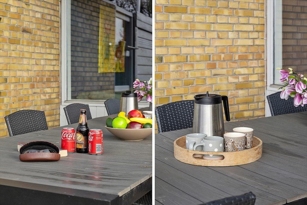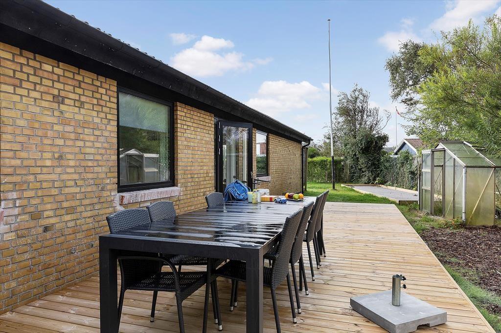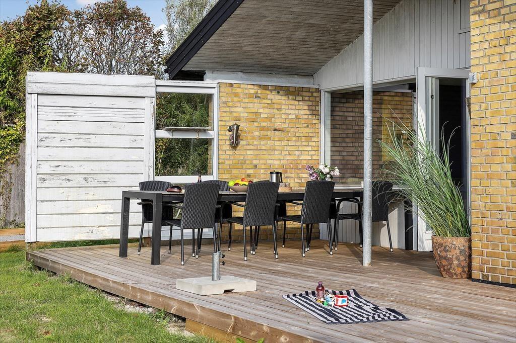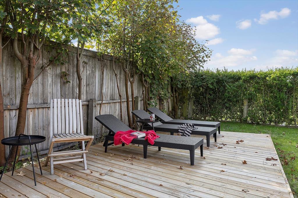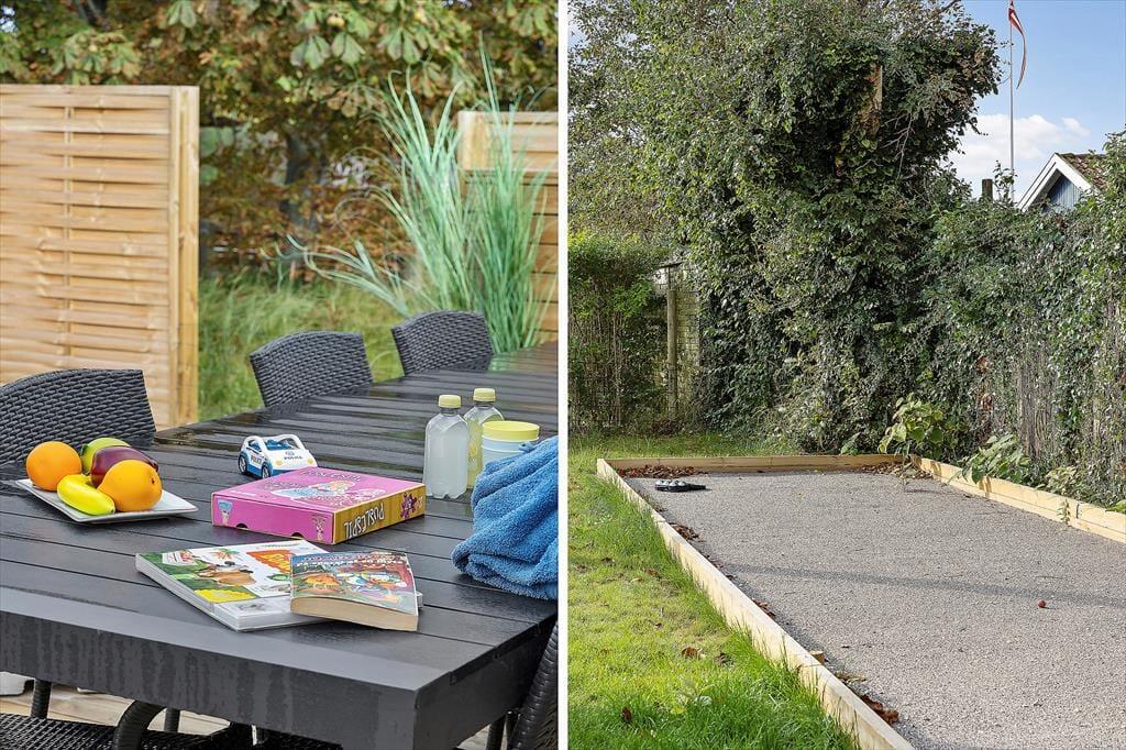 Udenfor fortsætter ferieidyllen i den lukkede have, hvor både store og små kan finde noget at glæde sig til. Terrasserne byder på solrige pletter og skyggefulde kroge, så du kan nyde din morgenkaffe i fred og ro, servere frokosten under åben himmel eller grille aftensmaden, mens duften breder sig i sommeraftenen. Haven er ideel til leg – her er legeredskaber til børnene og en petanquebane, som garanterer gode timer for de voksne. Har du hund med på ferie, kan du også roligt slippe den løs i de trygge rammer, hvor græsplænen giver masser af plads til leg og løb. Når solen går ned, er det oplagt at trække tæppet om skuldrene, tænde stearinlys og nyde den fredelige stemning, der kun findes i en have på en lys sommeraften i Nordjylland.