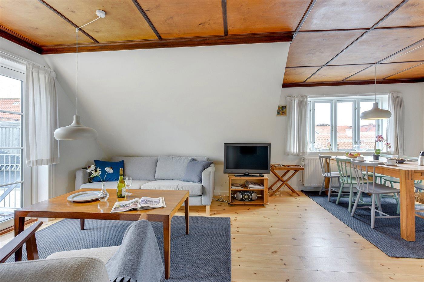 Ferielejlighed på 1. sal i et hyggeligt og moderniseret Skagenshus, beliggende på en lukket vej midt i Skagen, tæt ved strand og havn. Fælles lille og lukket have samt gårdhave med havemøbler står til rådighed. Bemærk: badeværelset ligger i stueetagen.