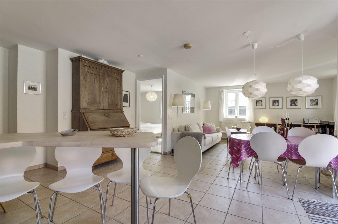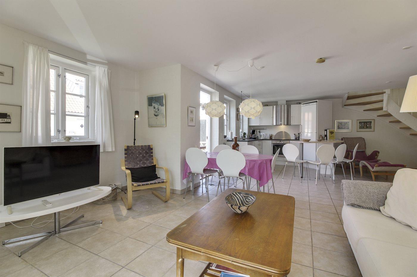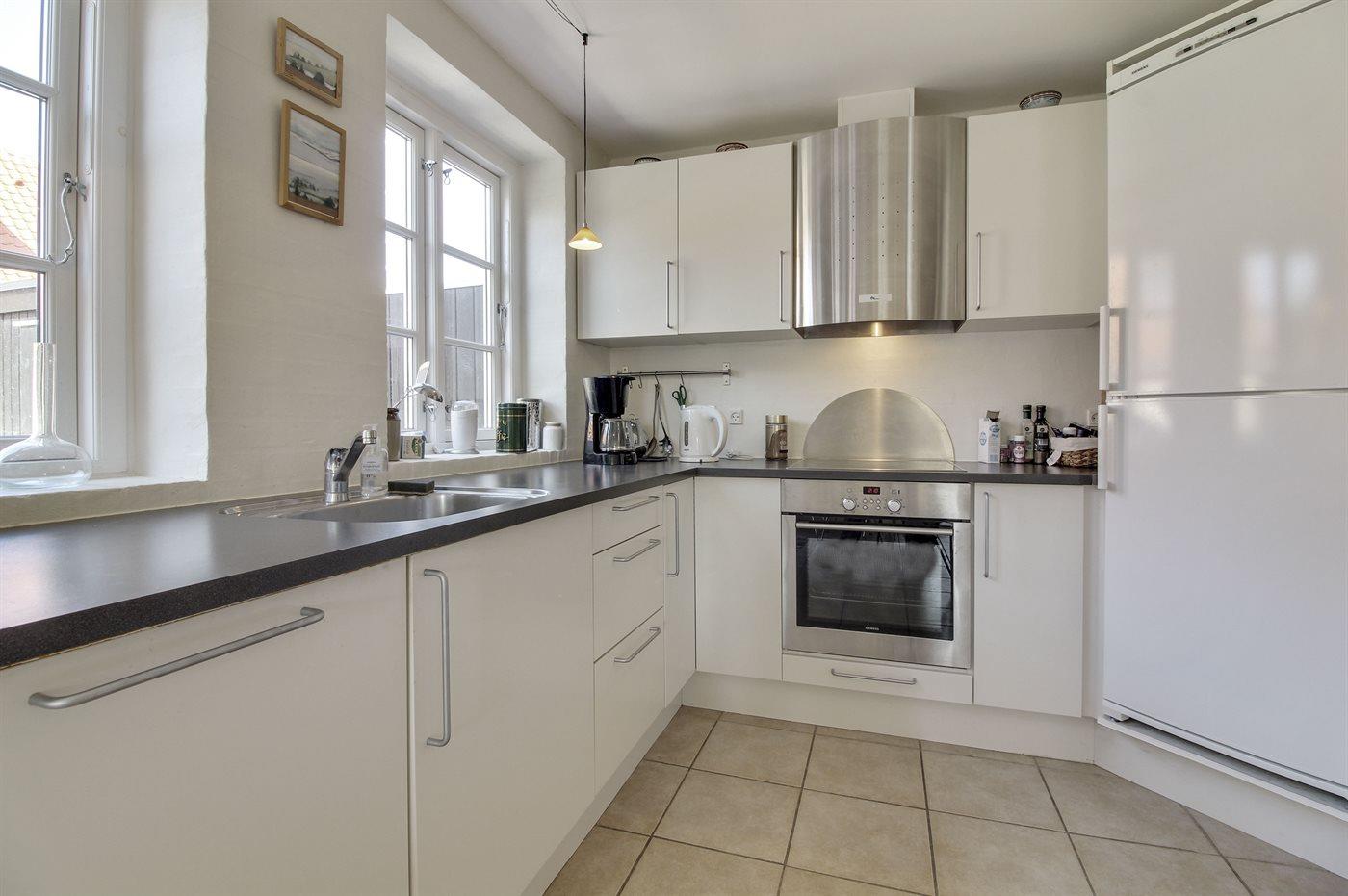 Køkkenet er udstyret med 1 køleskab. Der er 4 keramiske kogeplader, varmluftovn samt opvaskemaskine.