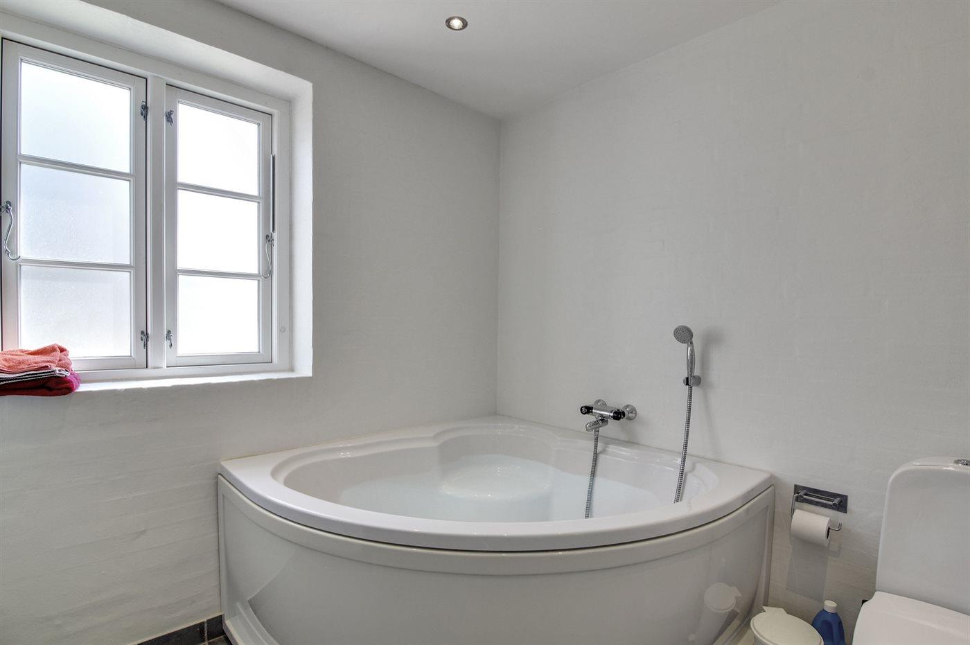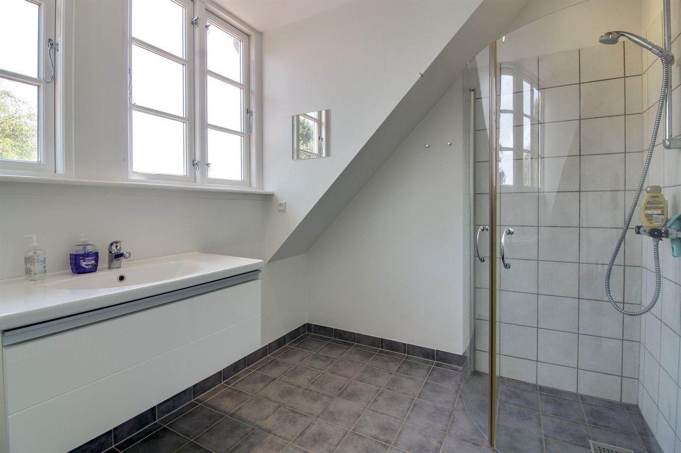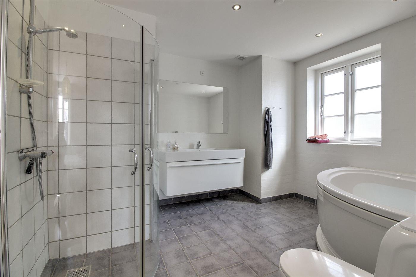 Der er 2 badeværelser med bruseniche og 2 toiletter. Der er gulvvarme på 1 badeværelse.. Badekar.