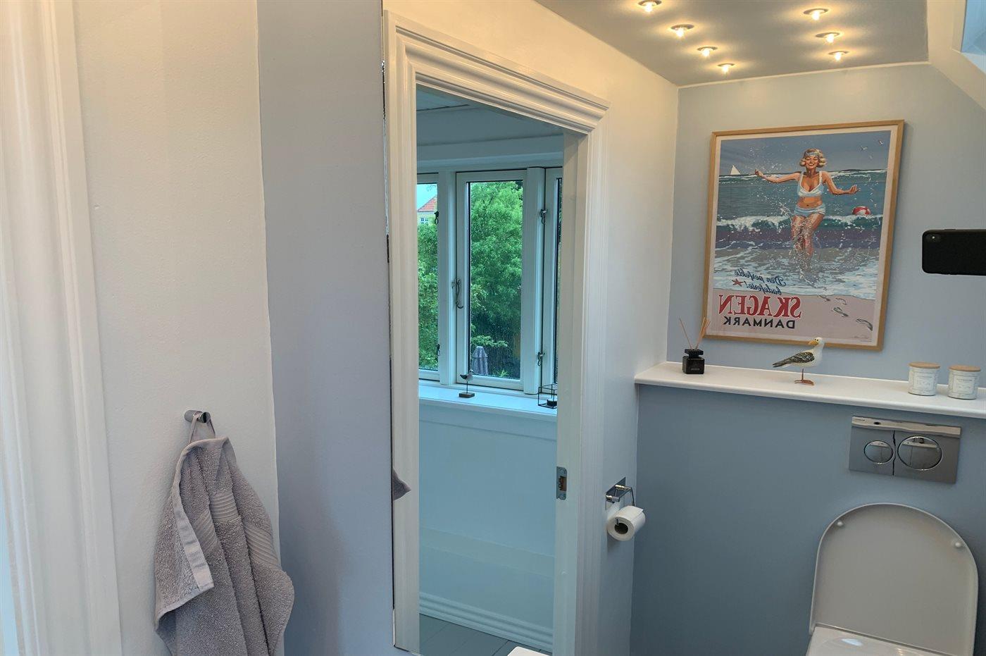 Der er badeværelse med bruser, toilet og gulvvarme i stueetagen og et toilet med gulvvarme på 1. sal. I stuen er der TV med Dongle + adgang til Netflix, Disney+ og ViaPlay i stuen, hvor der er adgang til danske, svenske, norske og 5 tyske kanaler. Desuden findes DVD/BlueRay-afspiller.