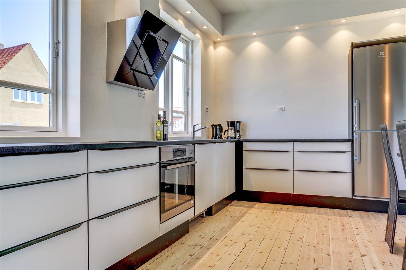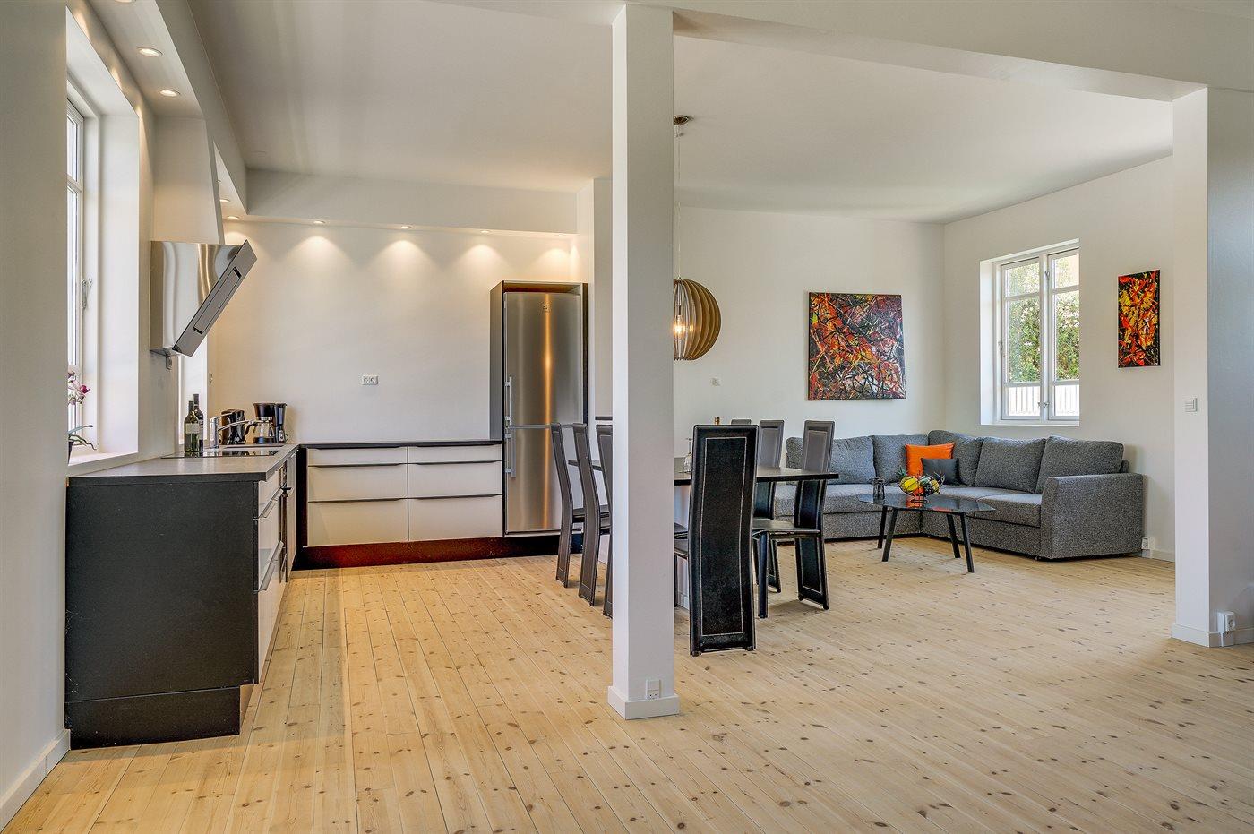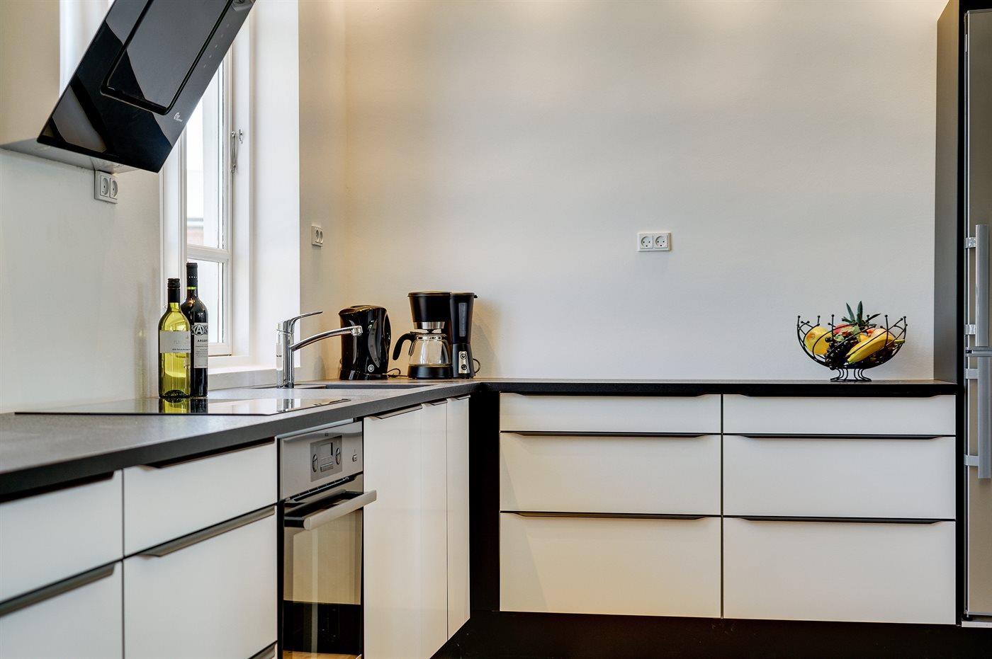 Køkkenet er udstyret med 1 køleskab. Der er 4 induktionskogeplader, varmluftovn, mikrobølgeovn samt opvaskemaskine.