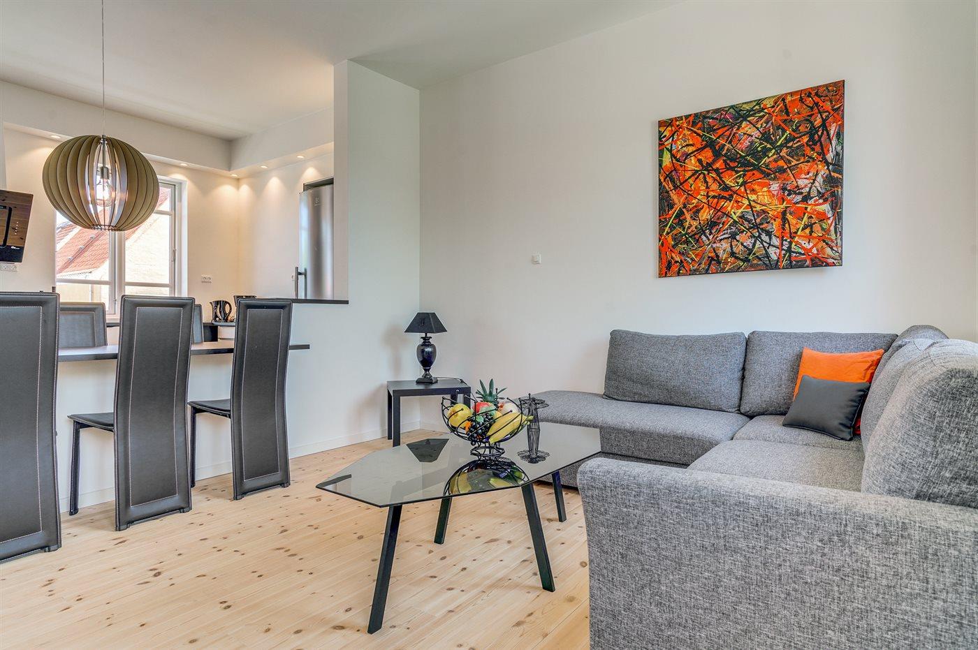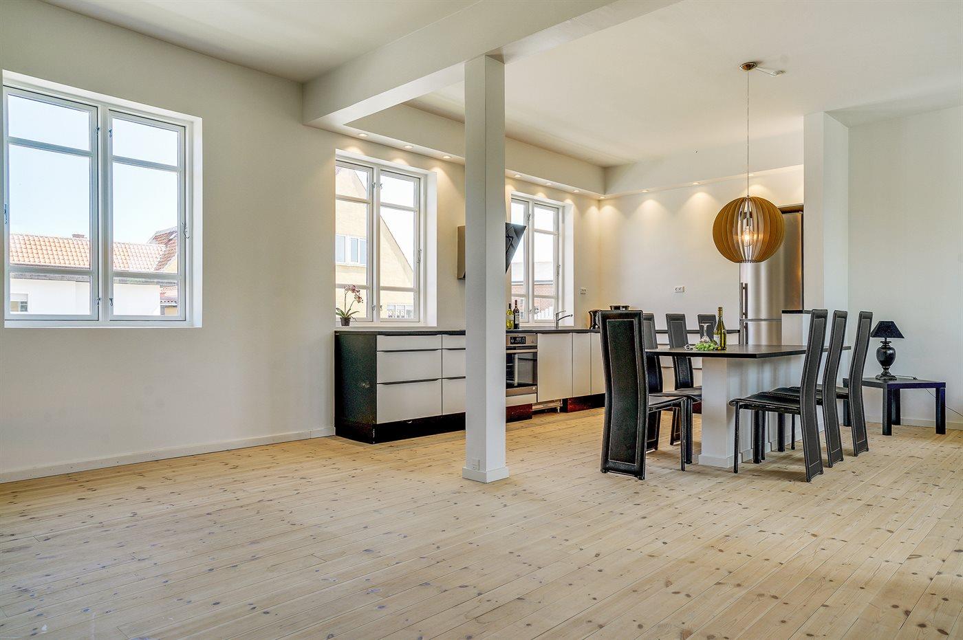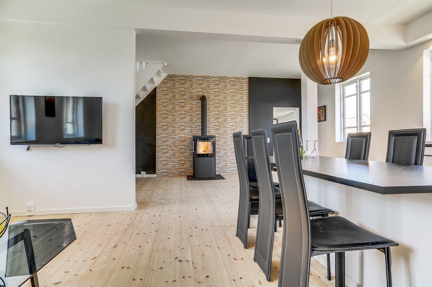 Køkkenet er udstyret med 1 køleskab. Der er 4 induktionskogeplader, varmluftovn, mikrobølgeovn samt opvaskemaskine.