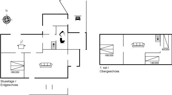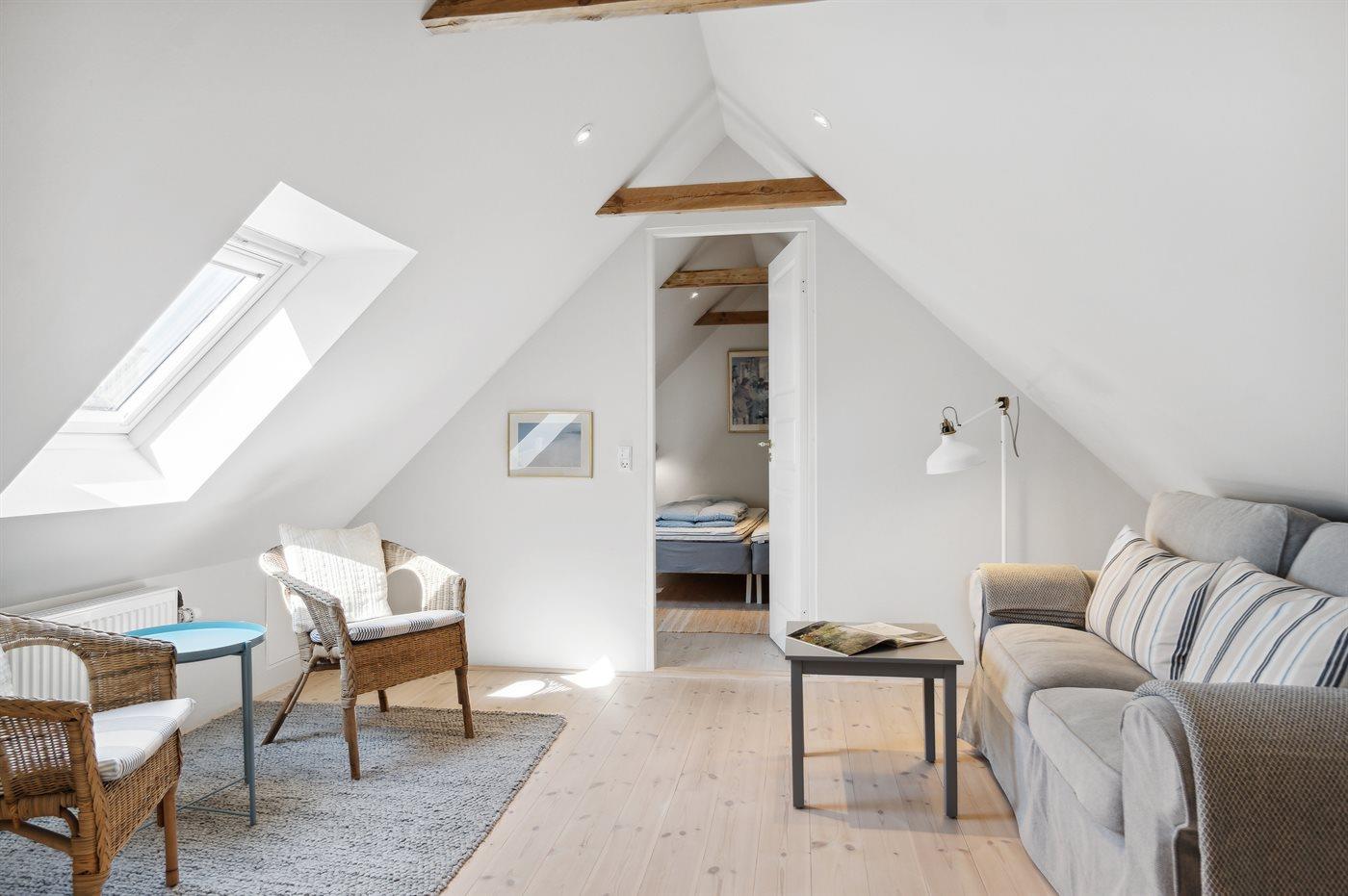 Der er i alt 3 soveværelser. Sovepladserne fordeler sig på: 4 sovepladser i dobbeltsenge. 2 sovepladser i enkeltsenge. Derudover er der 1 stk. barneseng.
