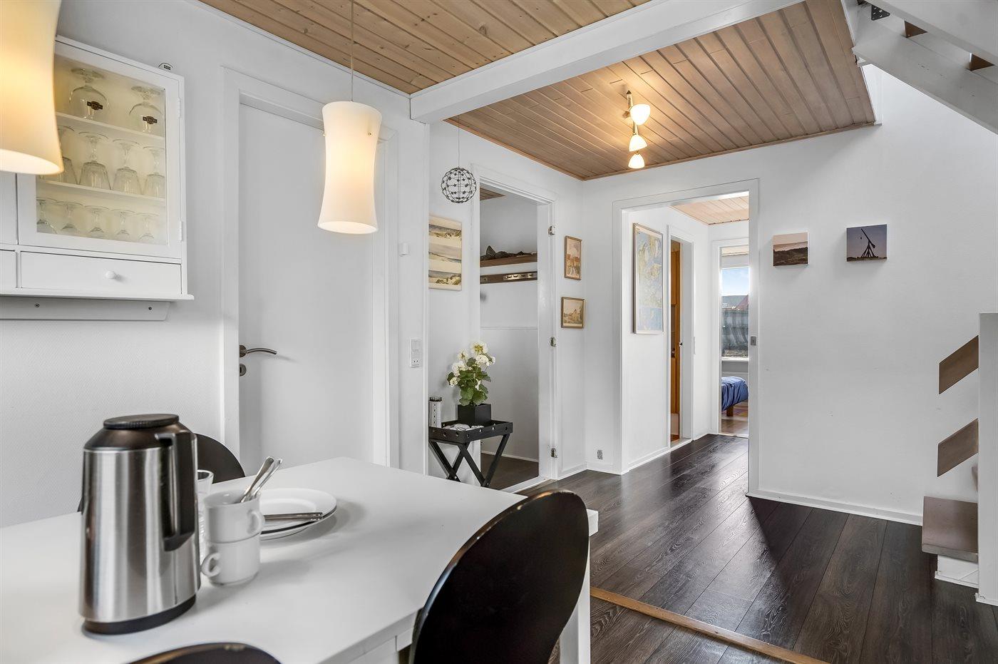 Køkkenet er udstyret med 1 køleskab. Der er 4 keramiske kogeplader, varmluftovn, mikrobølgeovn samt opvaskemaskine.