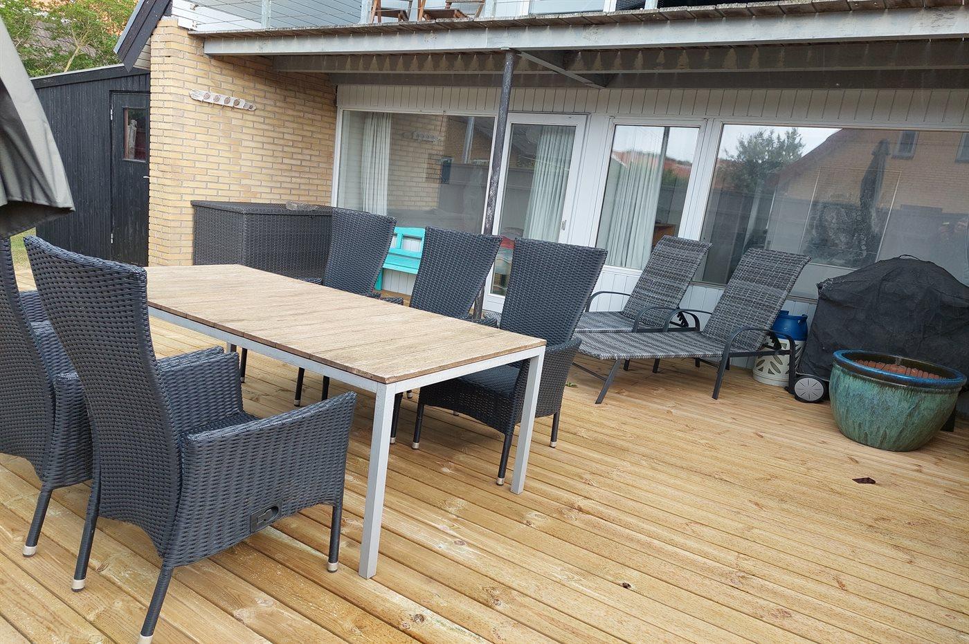 Ferieboligen er beliggende på en 200 m² stor naturgrund. Grunden er indhegnet. Der er 600 m til havet. Nærmeste forretning er beliggende i en afstand af 300 m. Til ferieboligen hører åbent terrasseareal. Desuden er der overdækket terrasse. Grill til rådighed. Parkering ved ferieboligen.