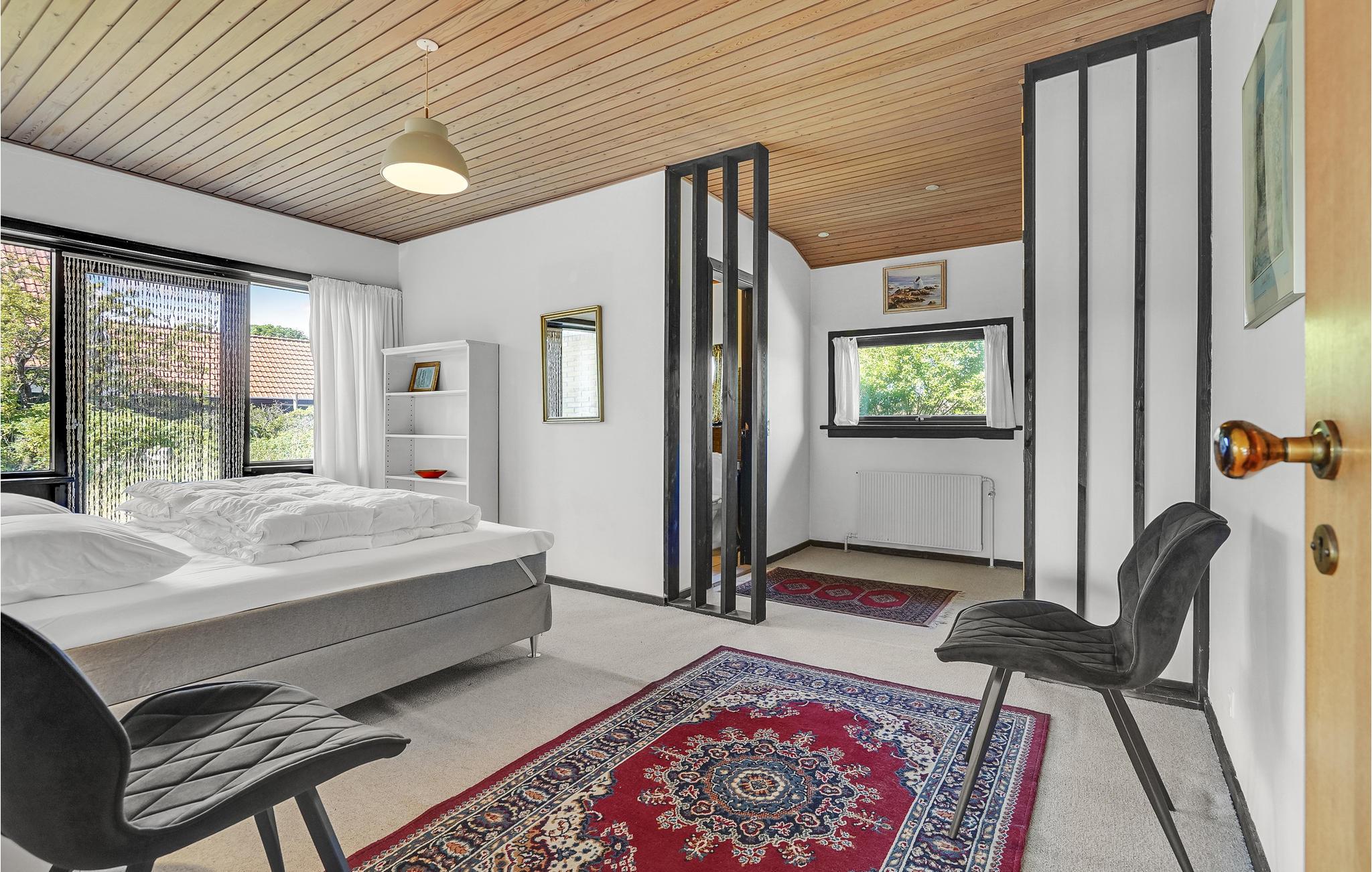 Huset har fire gode soveværelser og to badeværelser. I den åbne stue med store vinduer kan I slappe af foran pejsen. Herfra er der også udgang til terrassen bag huset. Nyd solen, mens I spiser dagens måltider. Det ene badeværelse har kun en håndbruser i badekarret.