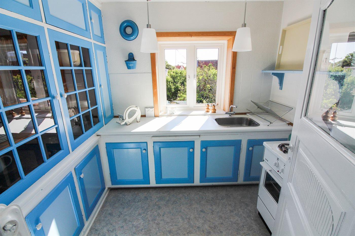 Køkkenet er udstyret med 1 køleskab. Der er 4 elkogeplader, bageovn, mikrobølgeovn.
