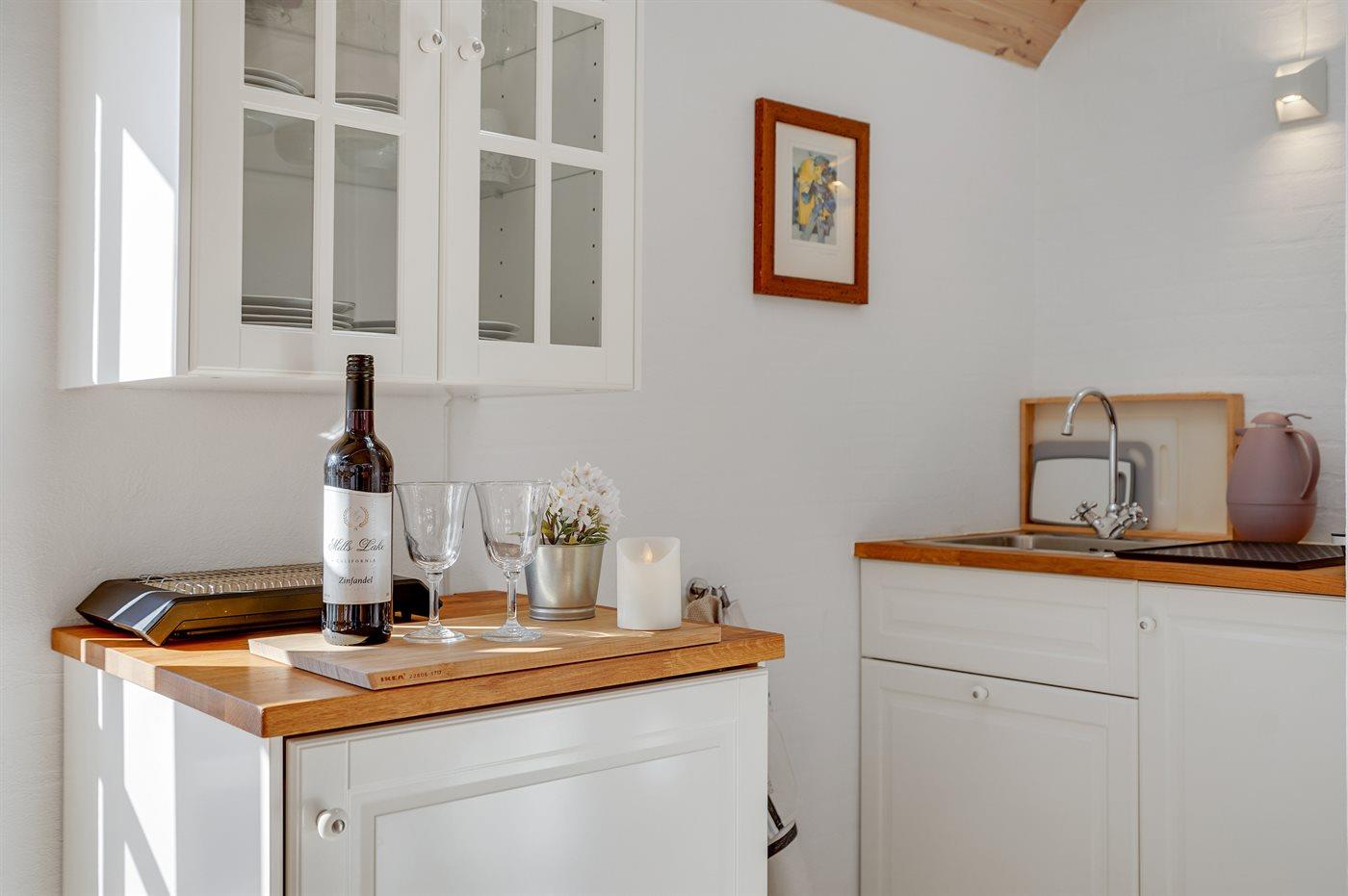 Køkkenet er udstyret med 1 køleskab. Der er 1 keramiske kogeplader, miniovn, mikrobølgeovn.