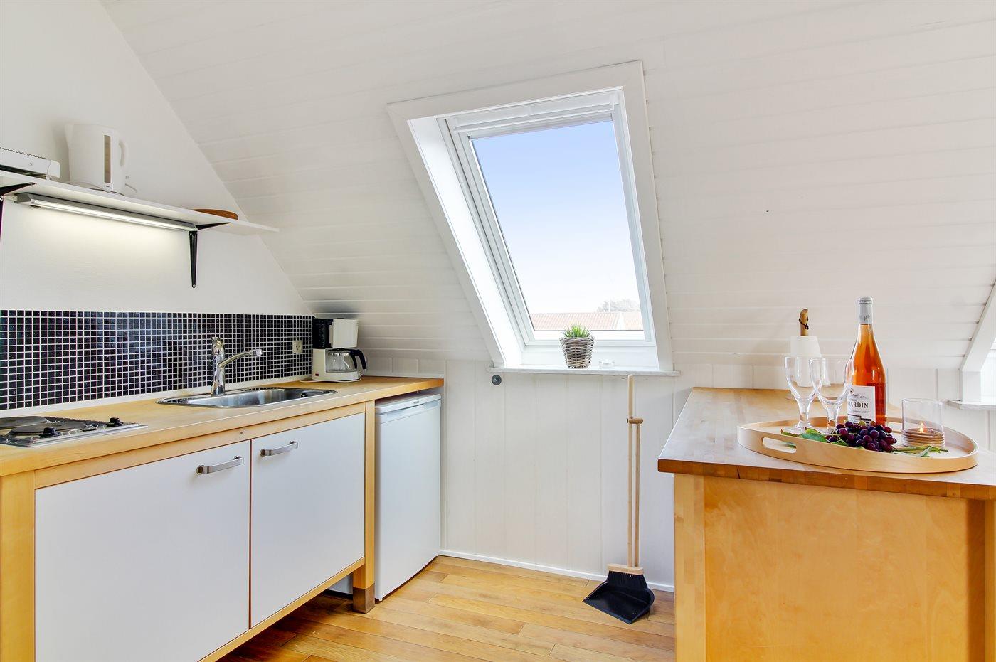 Køkkenet er udstyret med 1 køleskab. Der er 2 elkogeplader, miniovn, mikrobølgeovn.
