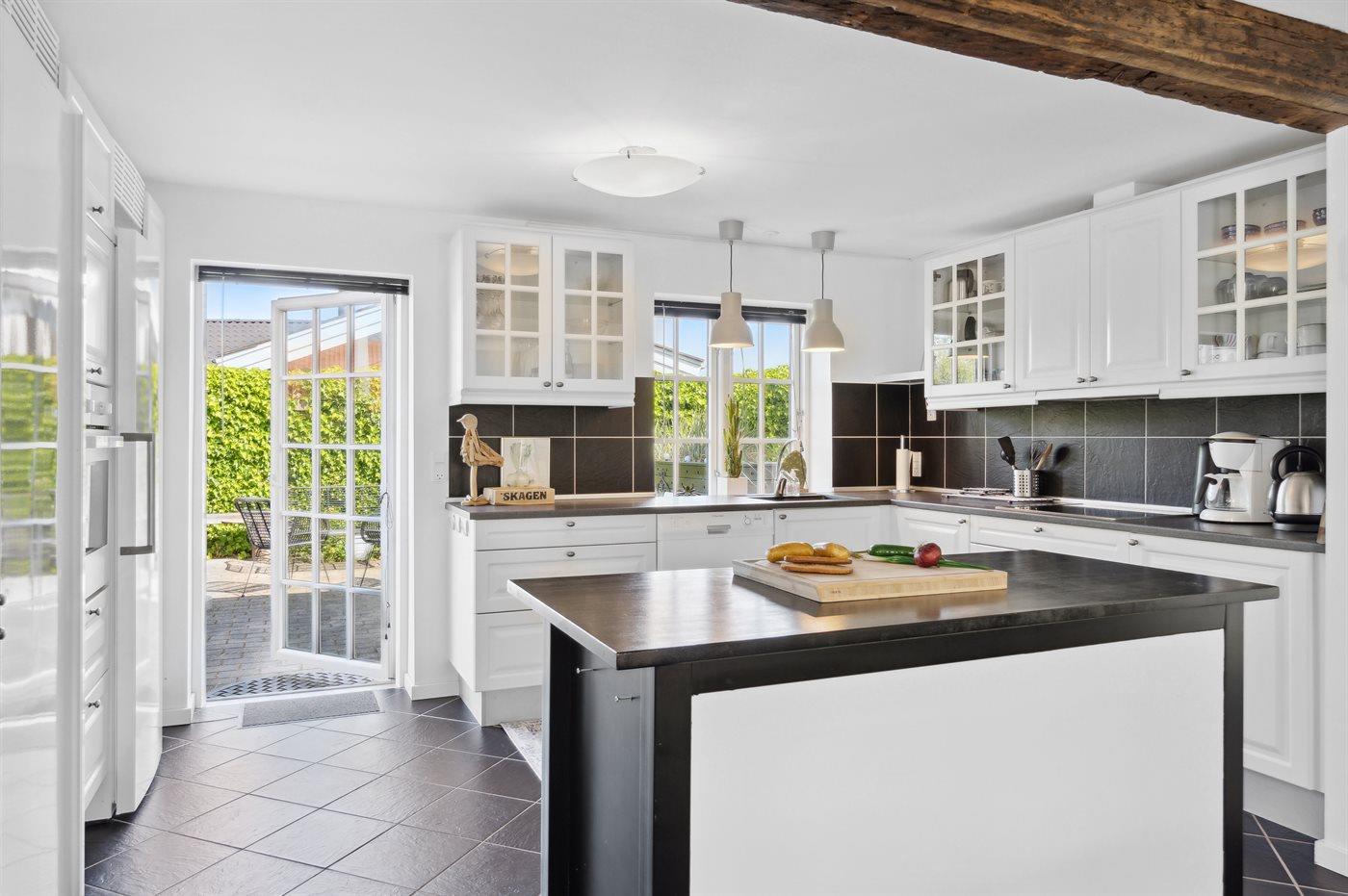 Køkkenet er udstyret med 1 køleskab. Der er 4 induktionskogeplader, varmluftovn samt opvaskemaskine.