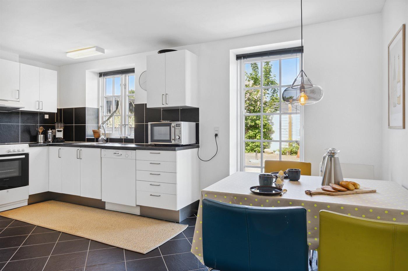 Køkkenet er udstyret med 1 køleskab. Der er 4 keramiske kogeplader, varmluftovn, mikrobølgeovn samt opvaskemaskine.