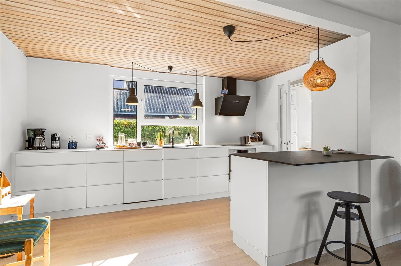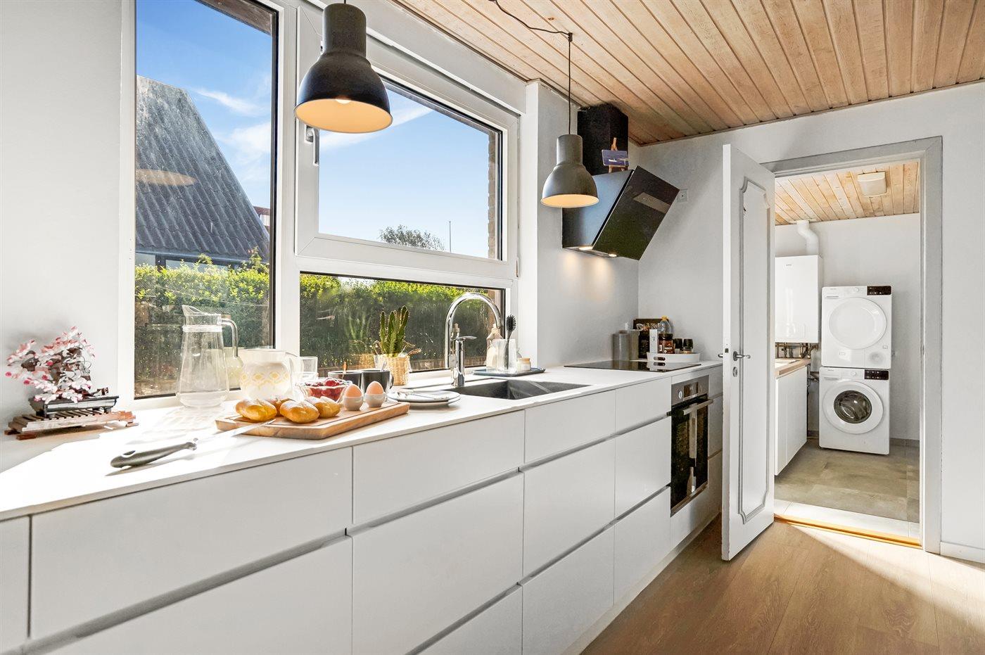 Køkkenet er udstyret med 1 køleskab. Der er 4 induktionskogeplader, varmluftovn samt opvaskemaskine.