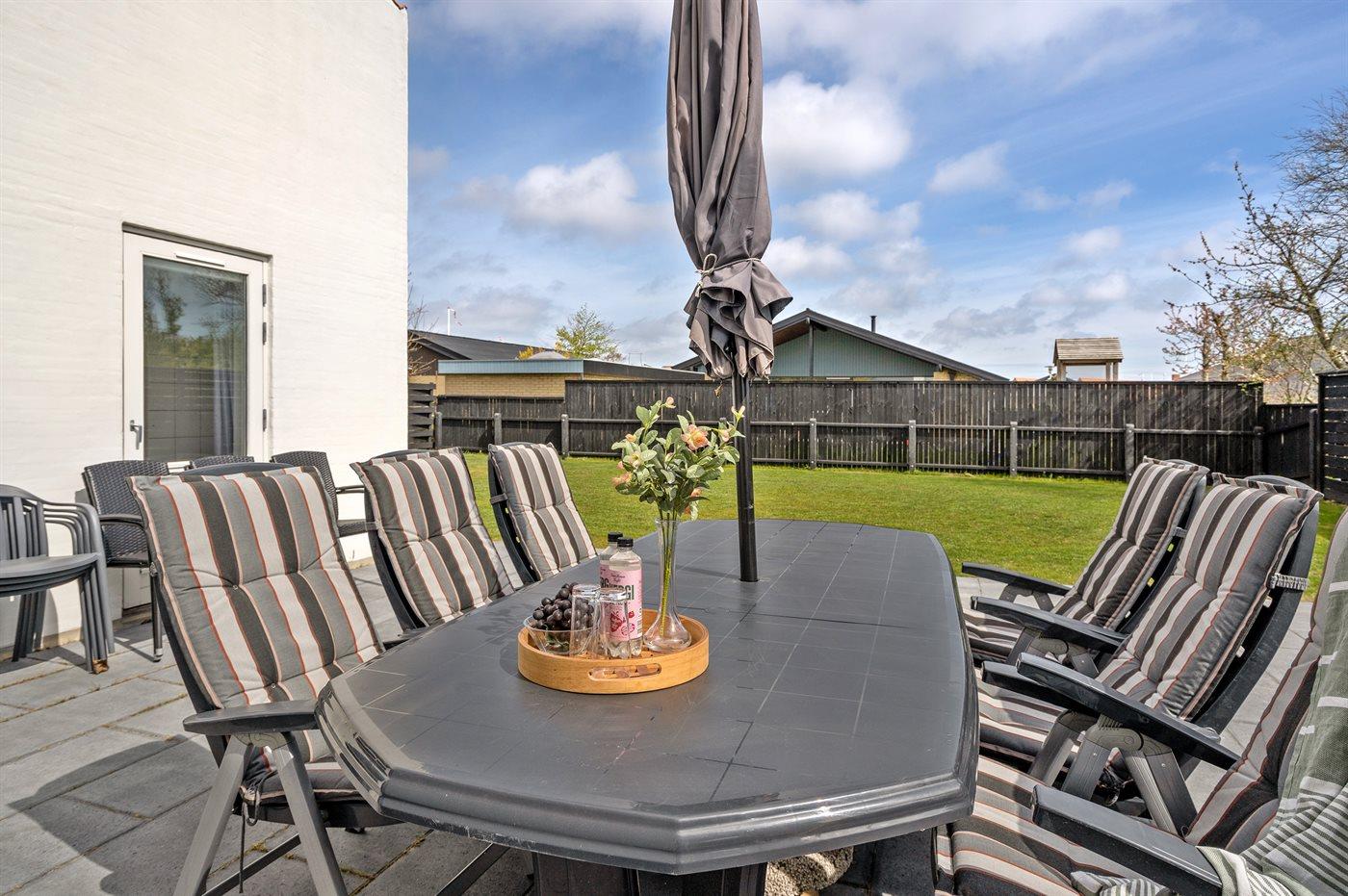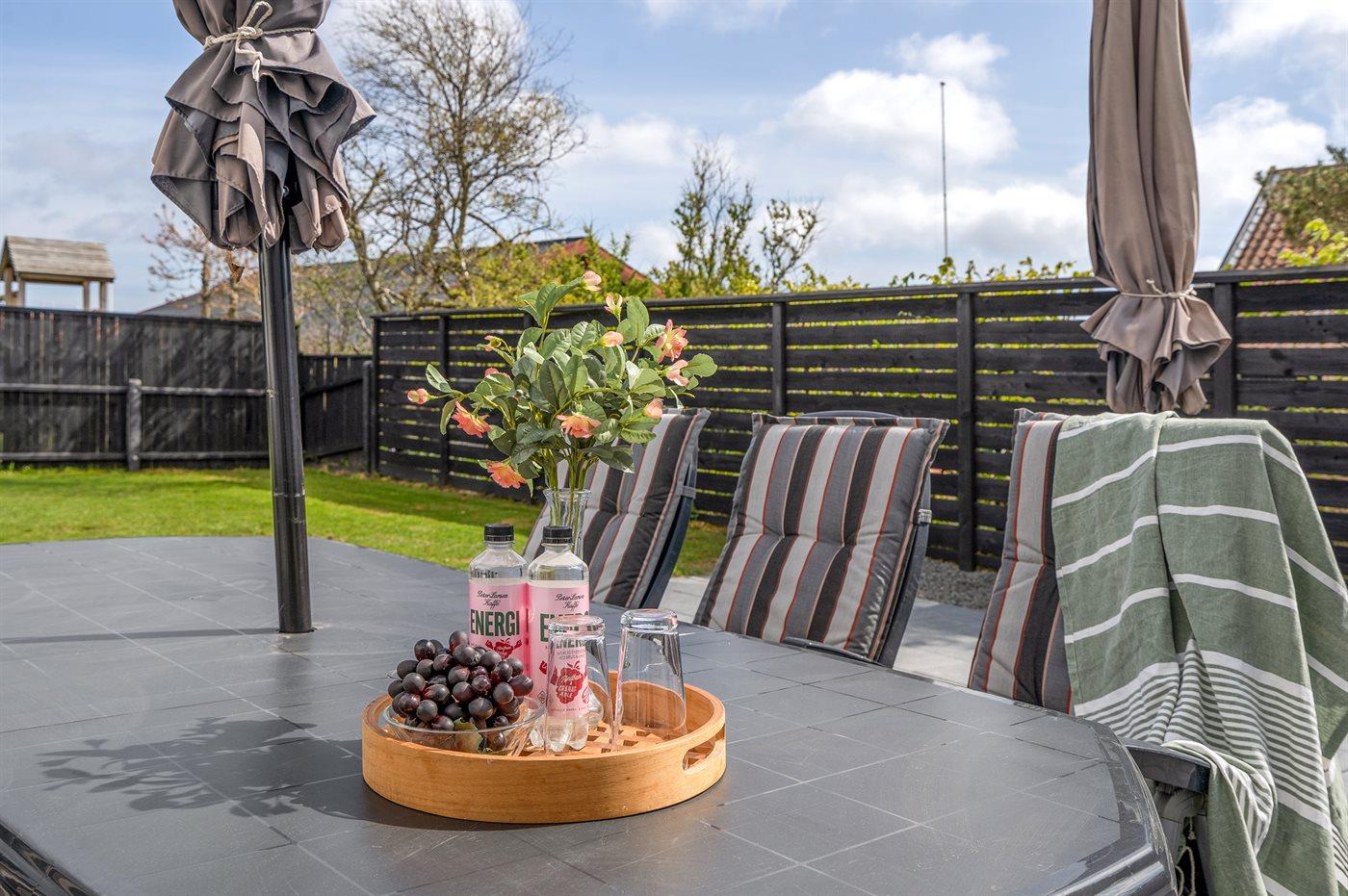 Ferieboligen er beliggende på en 600 m² stor naturgrund. Grunden er indhegnet. Der er 500 m til havet. Nærmeste forretning er beliggende i en afstand af 100 m. Til ferieboligen hører åbent terrasseareal. Desuden er der overdækket terrasse. Gasgrill står til rådighed. Parkering ved ferieboligen.