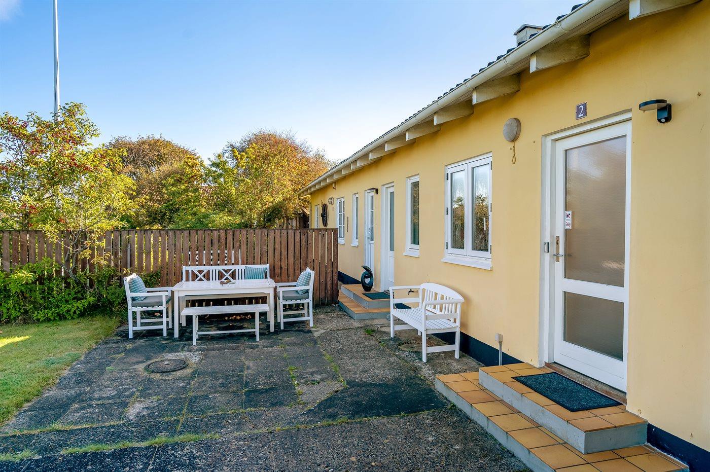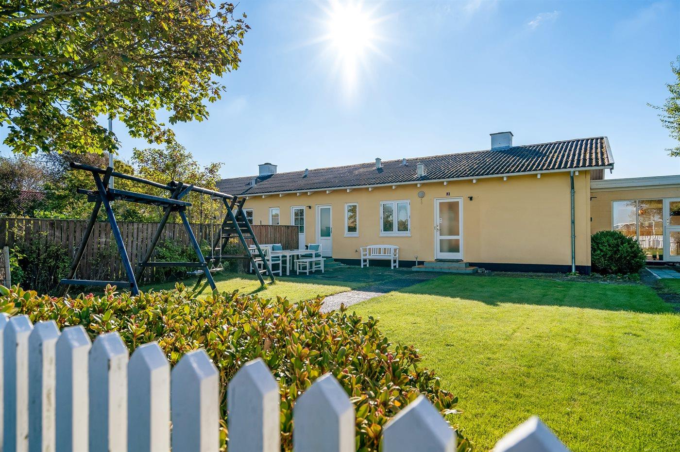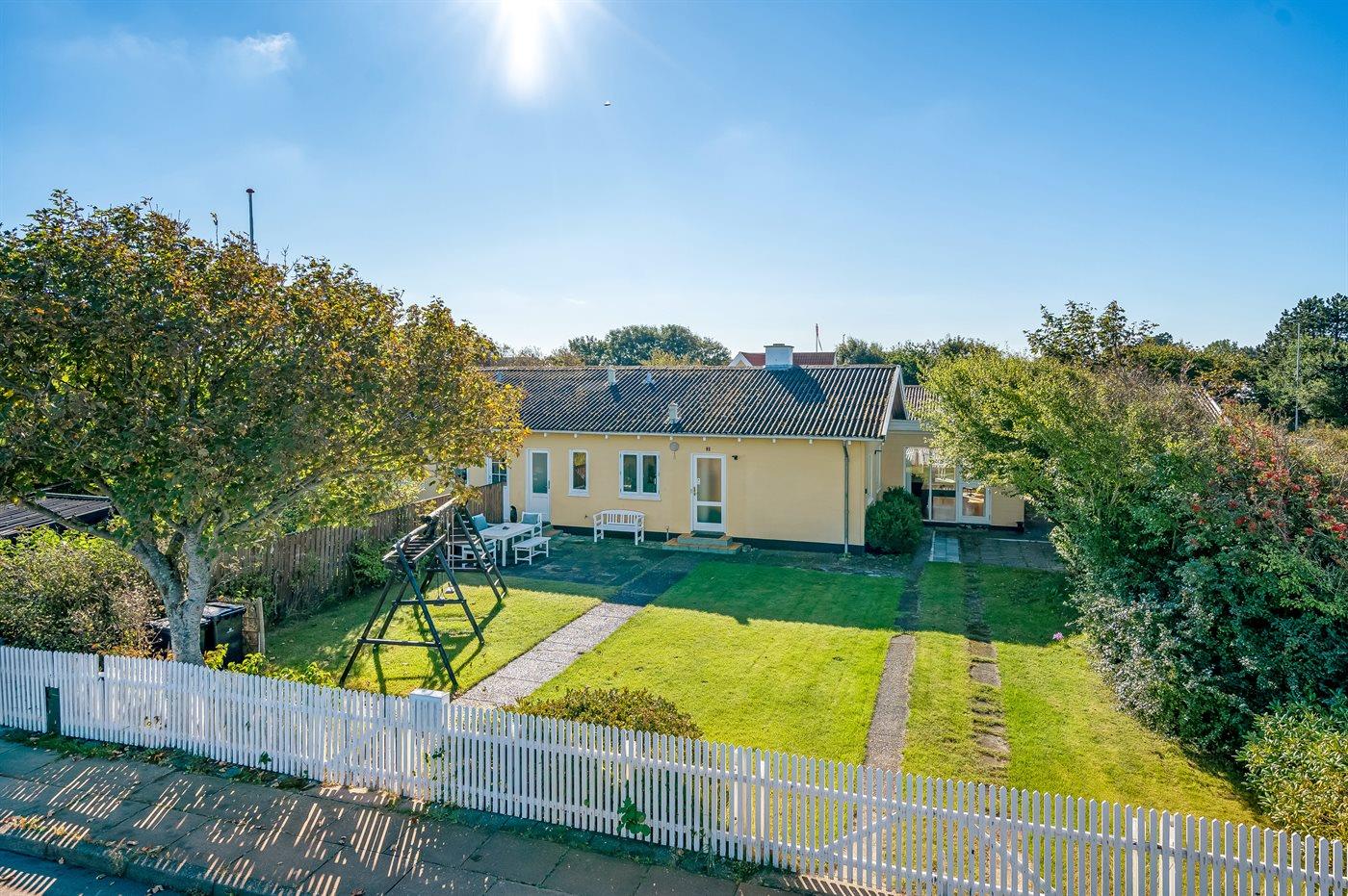 Huset ligger på en 500 m² stor naturgrund, som er indhegnet. Der er 700 m til havet og 700 m til nærmeste forretning. Foran huset findes der en åben terrasse og bagsiden af huset findes der en terrasse med markise. På grunden findes der gynge, sandkasse, legetårn og fodboldmål. Grill til rådighed. Parkering ved huset.