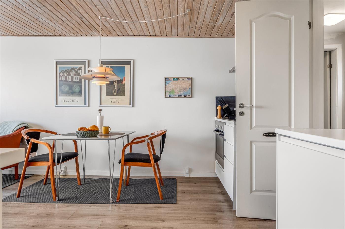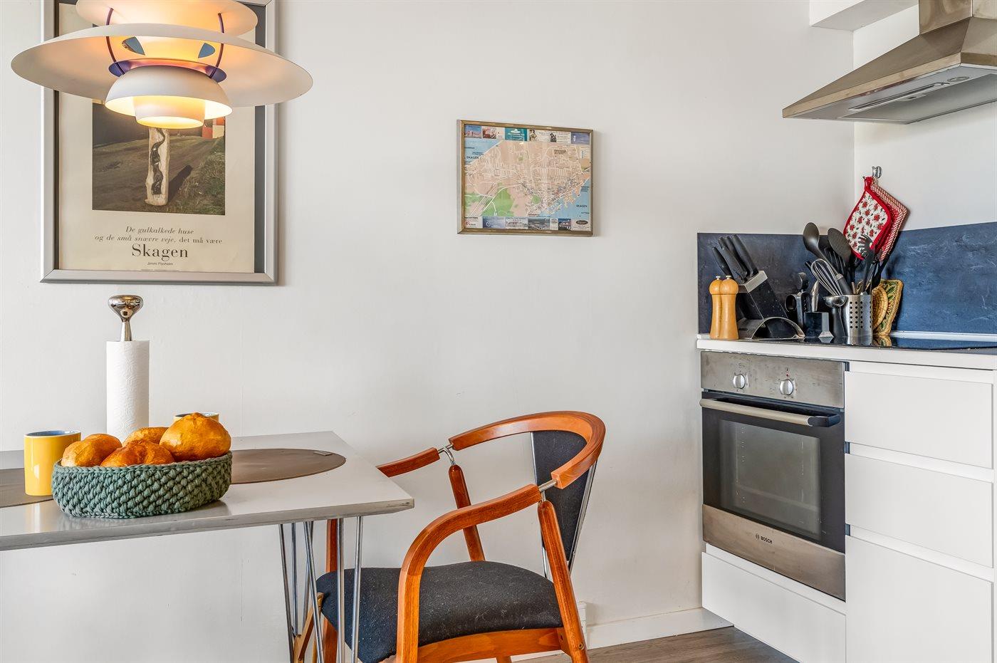 Charmerende ferielejlighed i Skagen Nordby med terrasse og moderne køkkenfaciliteter.