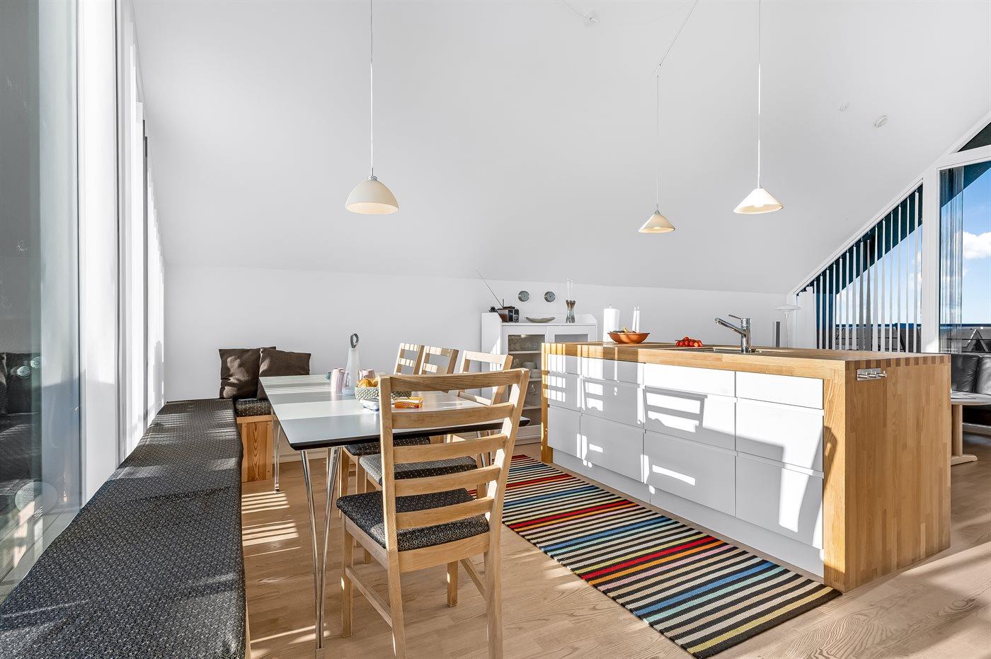 Køkkenet er udstyret med 2 køleskabe. Der er 4 keramiske kogeplader, varmluftovn, mikrobølgeovn samt opvaskemaskine.