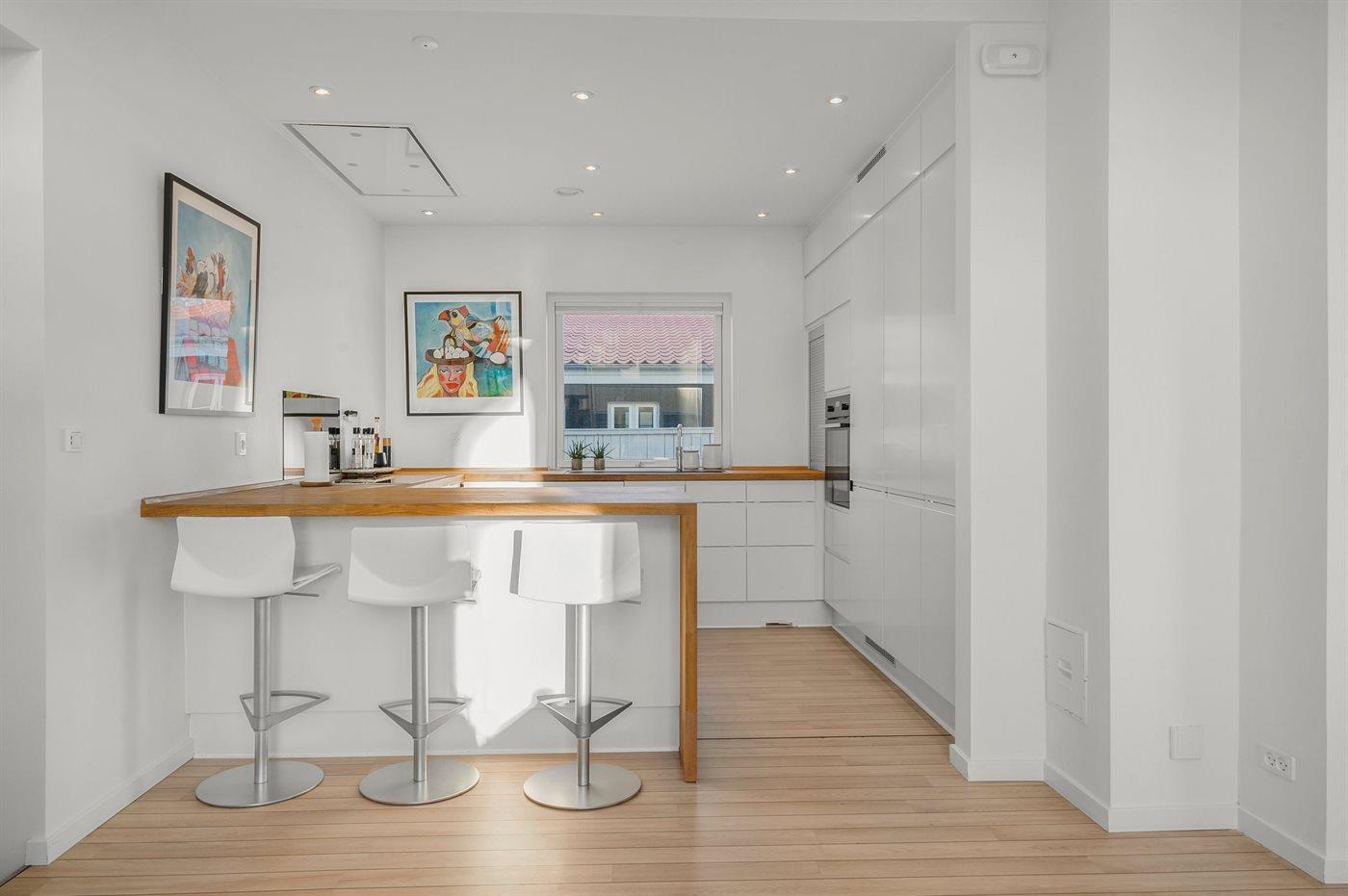 Køkkenet er udstyret med 1 køleskab. Der er 4 induktionskogeplader, varmluftovn samt opvaskemaskine.