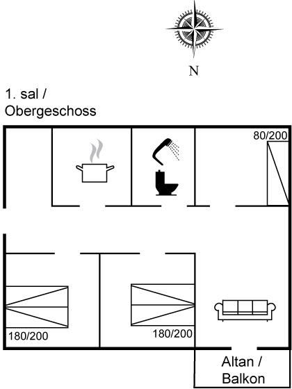Der er i alt 3 soveværelser. Sovepladserne fordeler sig på: 4 sovepladser i dobbeltsenge. 1 soveplads i enkeltseng.