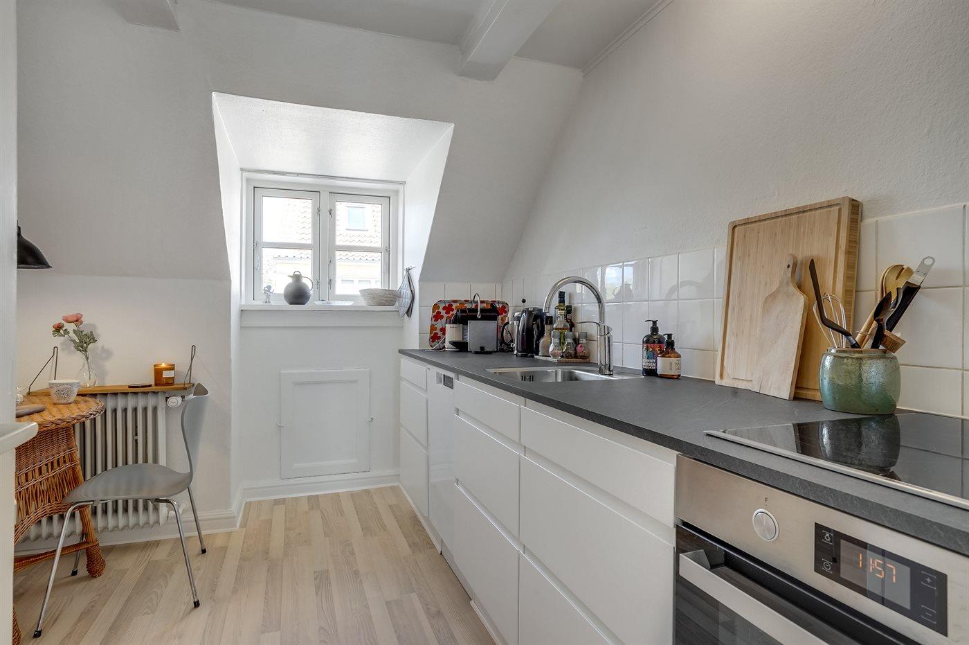 Køkkenet er udstyret med 1 køleskab. Der er 4 induktionskogeplader, varmluftovn samt opvaskemaskine.