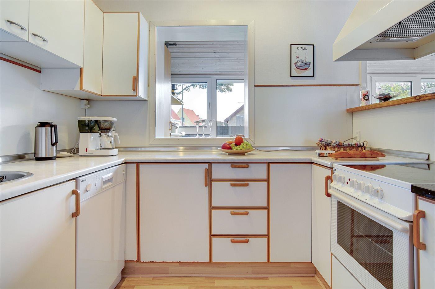 Køkkenet er udstyret med 1 køleskab. Der er 4 keramiske kogeplader, varmluftovn, mikrobølgeovn samt opvaskemaskine.