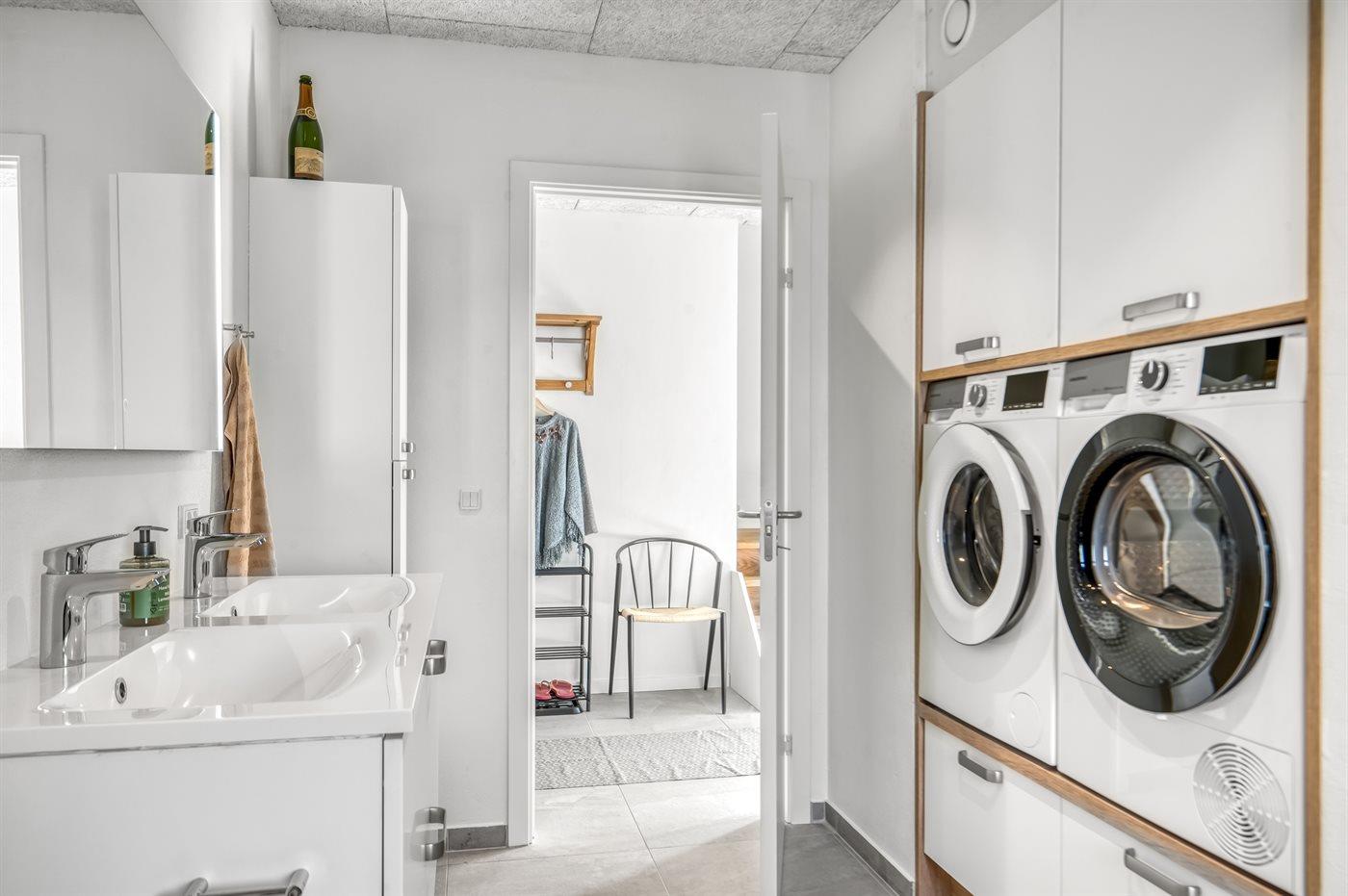 Ferieboligen har vaskemaskine og tørretumbler, så der kan vaskes og tørres efter en god gåtur. Der er også overdækket udendørs tørreplads, hvis man foretrækker at tørre tøj bæredygtigt.