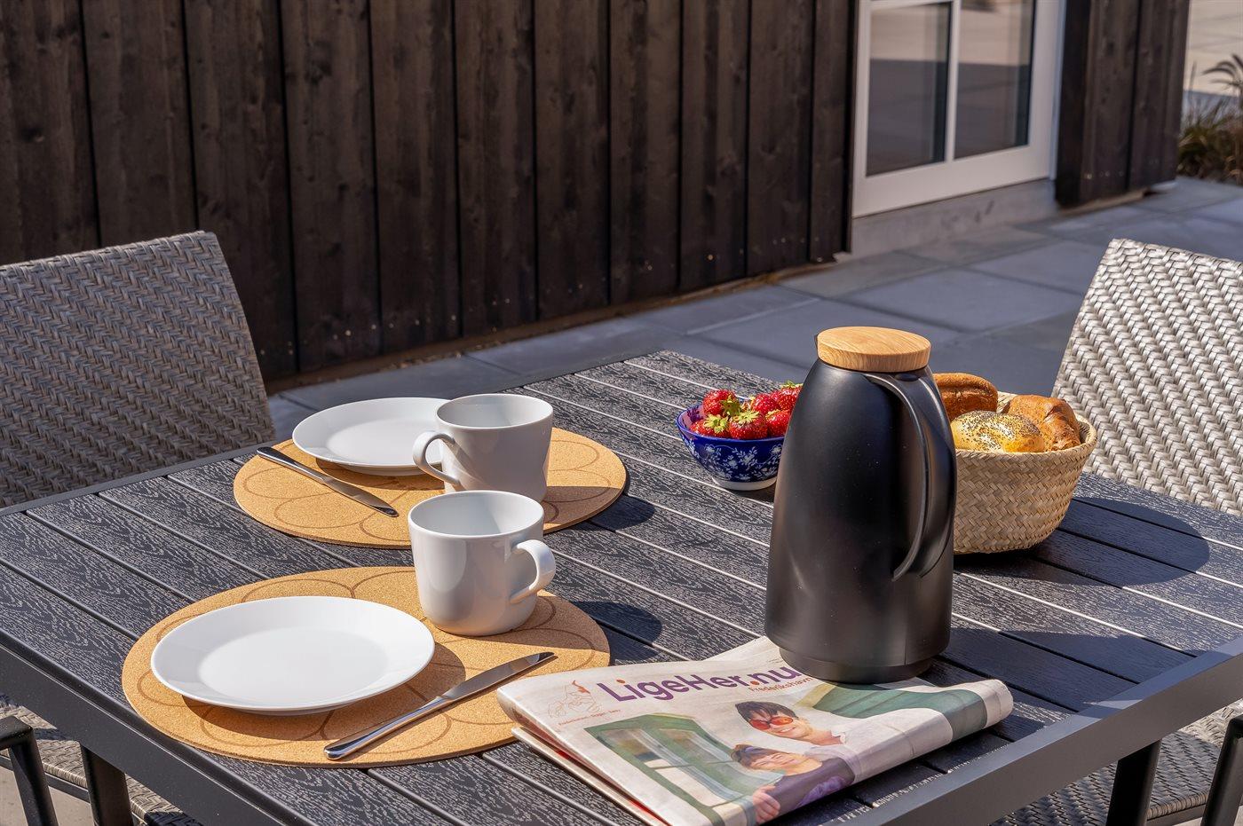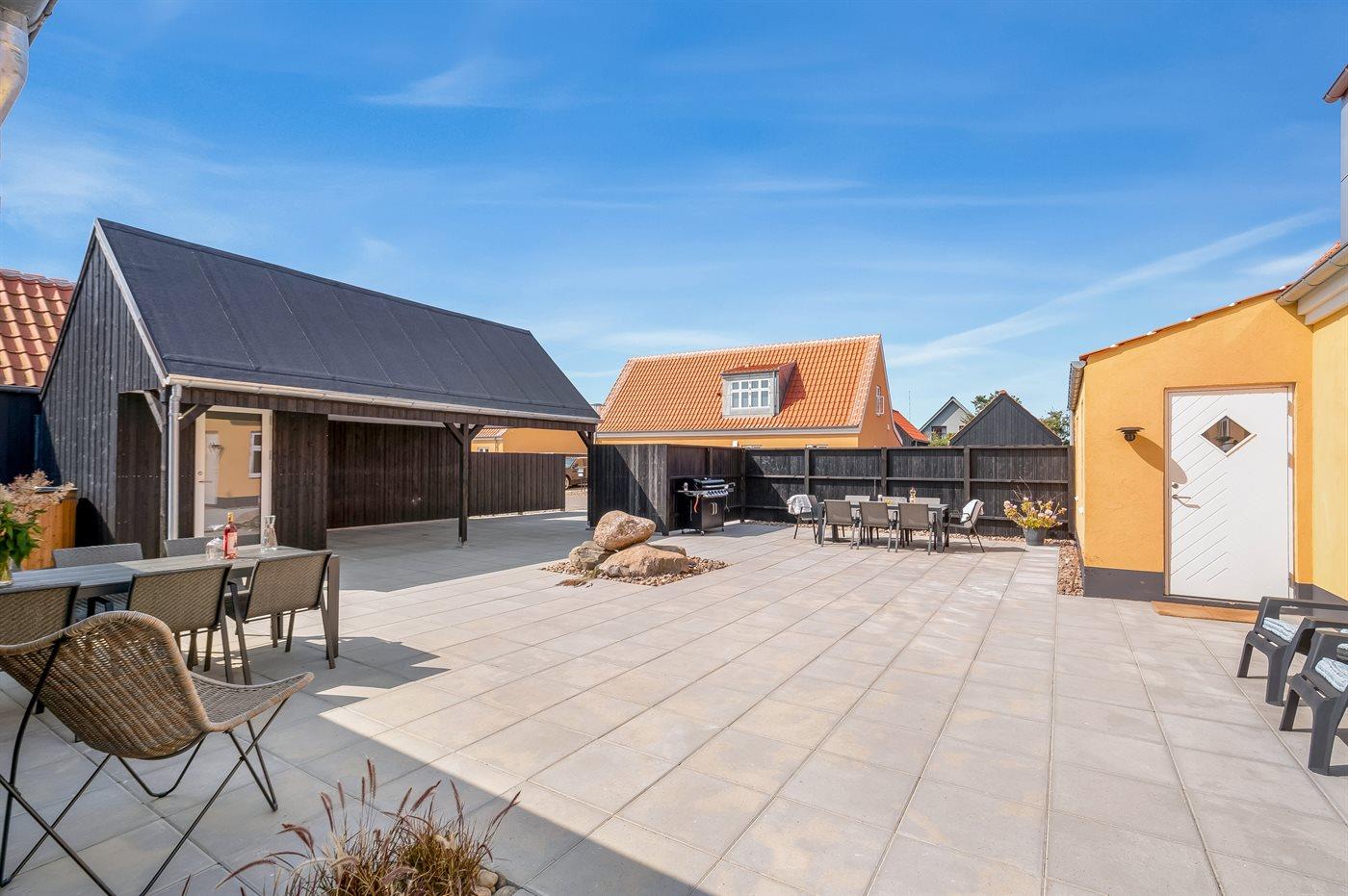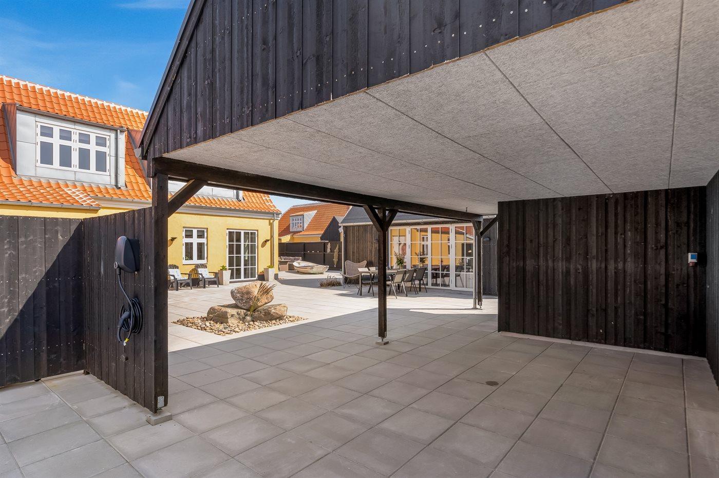 Udendørs er der både åbent terrasseareal og område med sofaarrangement, samt område med afslapning/wellness i udendørs sauna, varmtvandsbruser og standvandsspa til 8 personer. I redskabsrummet er der gode hynder til havemøblerne. Der er en flot gasgrill til rådighed. Der er god bred carport og plads til tre biler i alt. Der er er installeret stik til gratis opladning af elbil med 11 kW ladeeffekt.