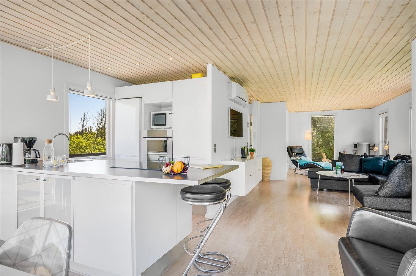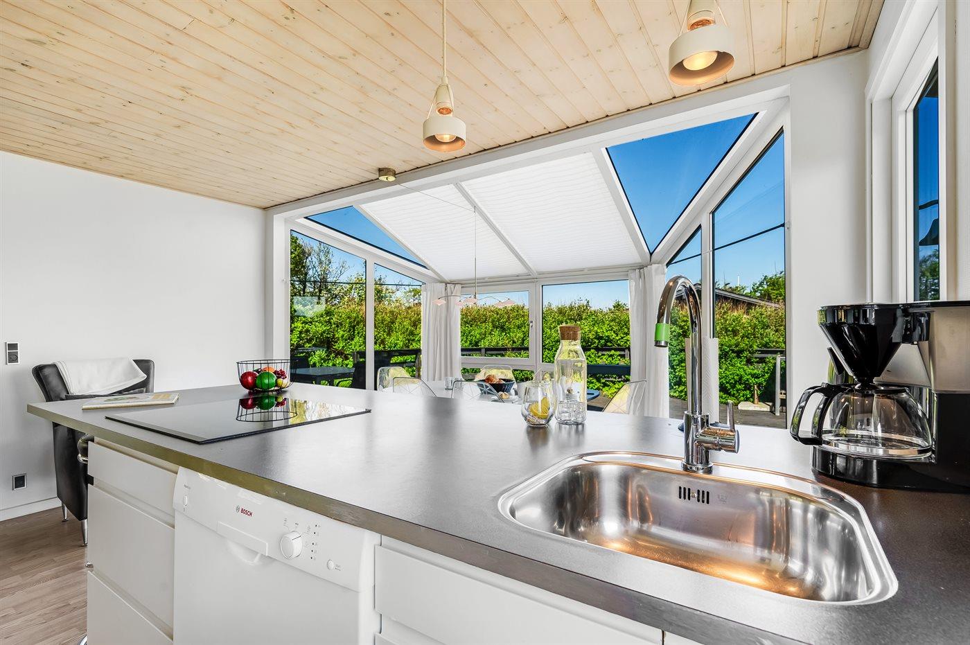 Køkkenet er udstyret med 1 køleskab. Der er 4 keramiske kogeplader, varmluftovn, mikrobølgeovn samt opvaskemaskine.