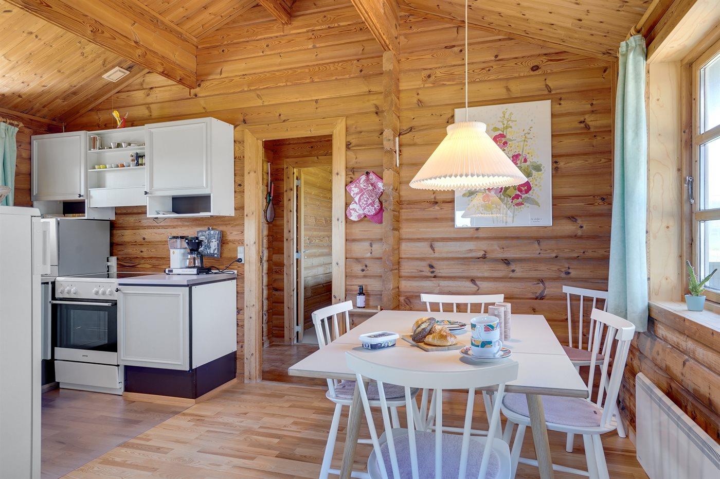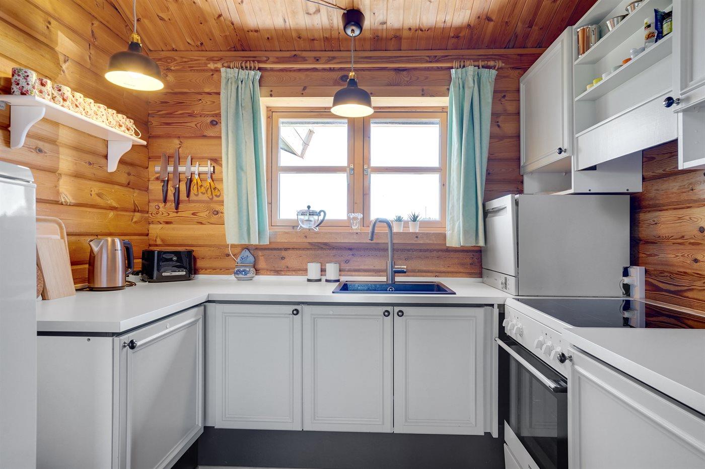 Køkkenet er udstyret med 1 køleskab. Der er 4 keramiske kogeplader, varmluftovn samt opvaskemaskine (bordmodel).