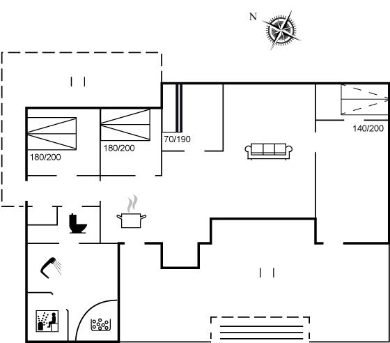 Der er i alt 4 soveværelser. Sovepladserne fordeler sig på: 4 sovepladser i dobbeltsenge. 2 sovepladser i køjeseng. 2 sovepladser i sovesofa (dobbelt). Derudover er der 1 stk. barneseng.