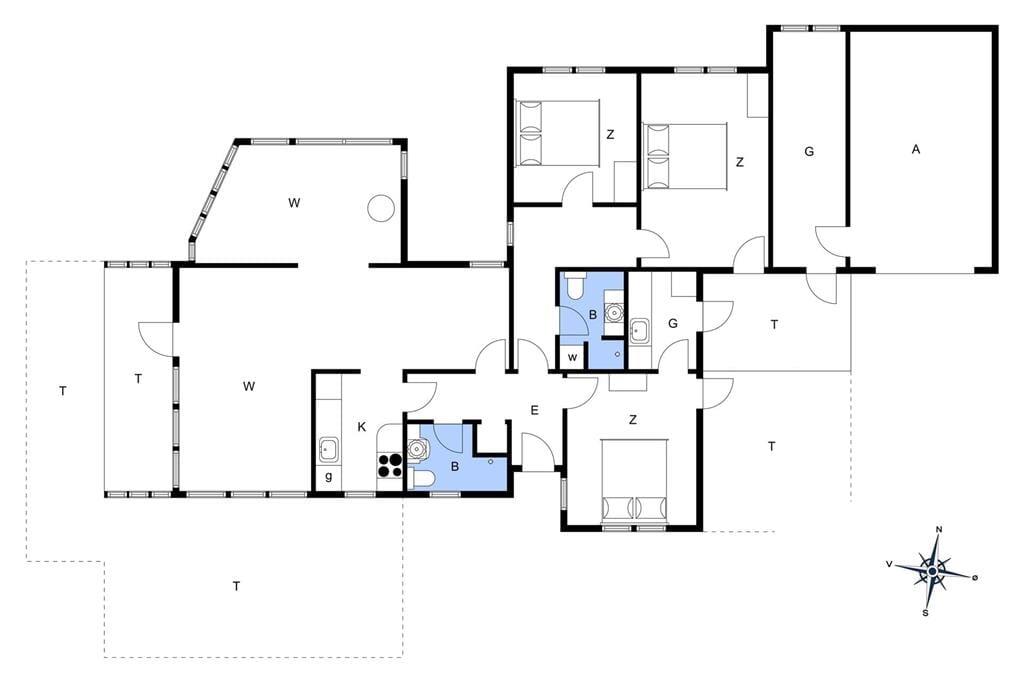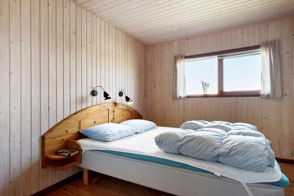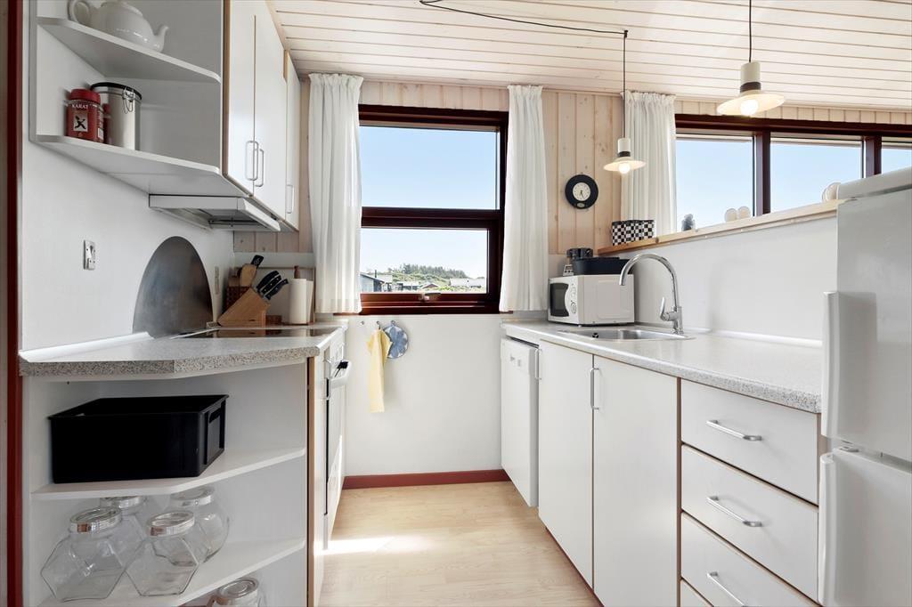 Huset har en optimal indretning, hvad enten det er en familieferie eller en parferie med gode venner, I planlægger. To badeværelser og tre værelser med i alt seks sengepladser er placeret i husets østvendte afdeling, mens køkken og stuer ligger samlet som én stor opholdsafdeling mod vest. Opholdsafdelingen er et dejligt sted at tilbringe tiden, uanset om I kokkererer i det veludstyrede køkken, nyder aftensmaden ved spisebordet eller slår jer ned i en af de bløde sofaer. Hvis I rykker ned i den ene stue, som ligger en smule sænket i forhold til resten af opholdsafdelingen, kan I oven i købet tænde op i brændeovnen og hygge jer nær den knitrende varme.