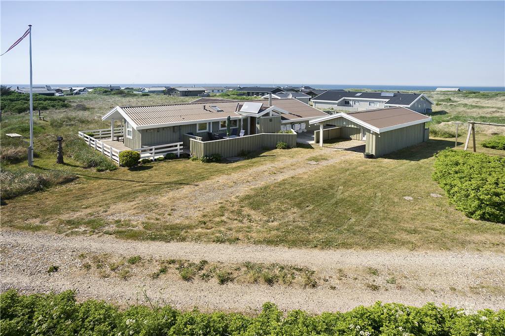 Der er træterrasse på 4 sider af huset i niveau med udgangene fra huset, møbleret med havemøbler, parasol, solvogne og grill samt sandkasse og solopvarmet bruser. Terrassen er delvist indhegnet så de mindste børn og hund ikke løber væk - der kan altid findes læ til at nyde solen og den dejlige vesterhavsluft. Et stykke af terrassen er overdækket, hvilket gør at man kan nyde solen både tidligt og sent på året. Uden for terrasseområdet er der gyngestativ samt carport. Skønt feriehus, som er særdeles velegnet til flere familier eller generationer.