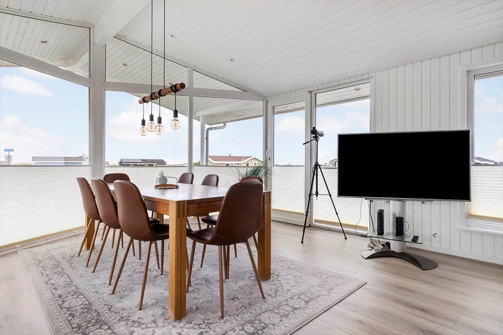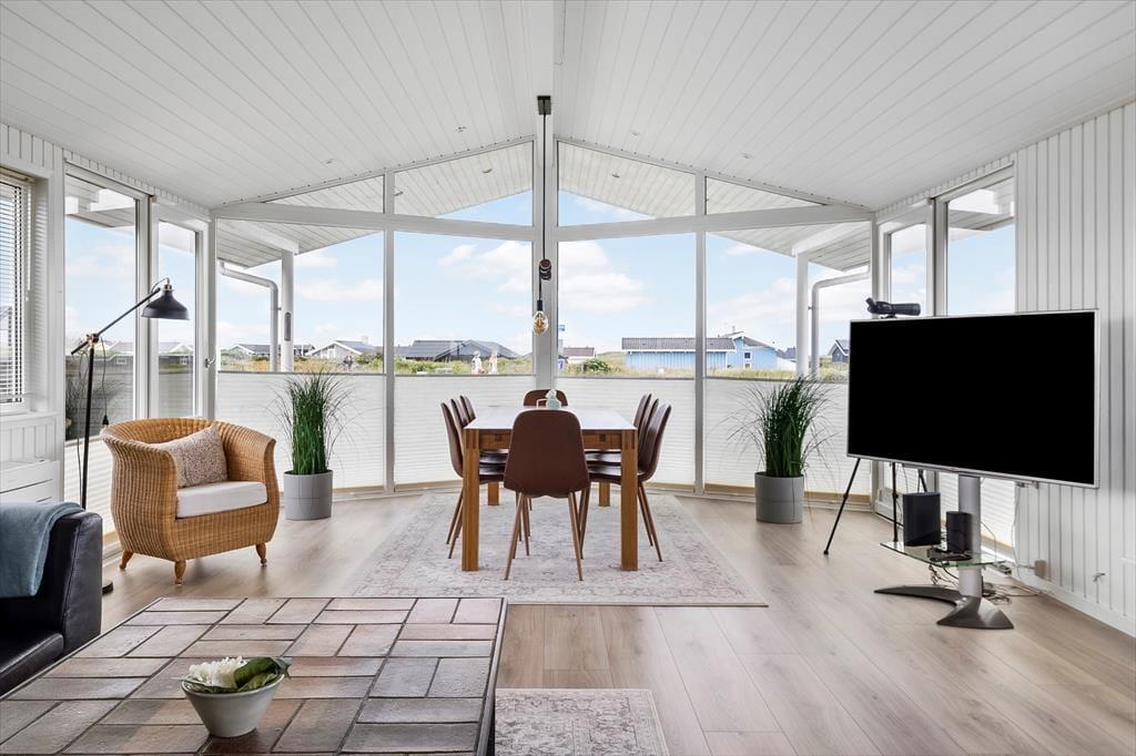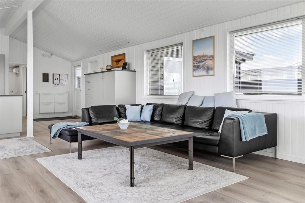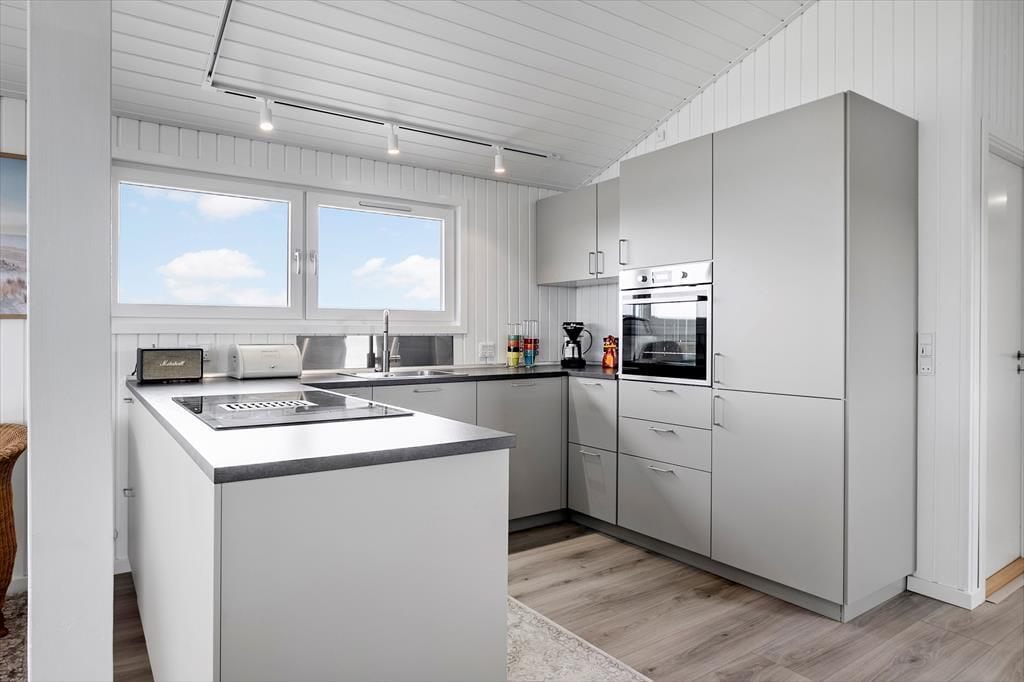 Indenfor i sommerhuset mødes du af et moderne og indbydende design, hvor der er tænkt på både funktionalitet og æstetik. Det store, åbne køkken er et af husets absolutte højdepunkter, hvor du kan forberede lækre måltider i rolige omgivelser. De smarte detaljer og lækre materialer skaber en varm og indbydende atmosfære, som gør det til et behageligt sted at tilbringe tid sammen med familien. Her er der rig plads til at samles, uanset om det drejer sig om at nyde en middag eller slappe af efter en dag med oplevelser. De tre soveværelser giver mulighed for, at op til seks personer kan bo komfortabelt, og det lyse, åbne opholdsrum byder på masser af naturligt lys.