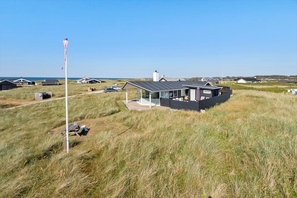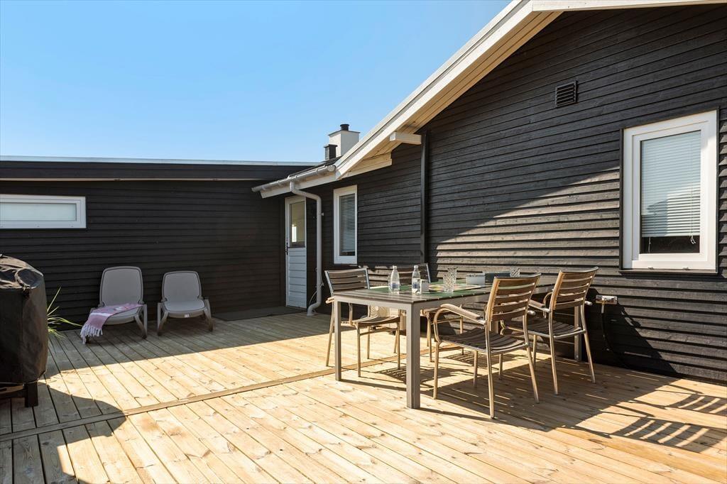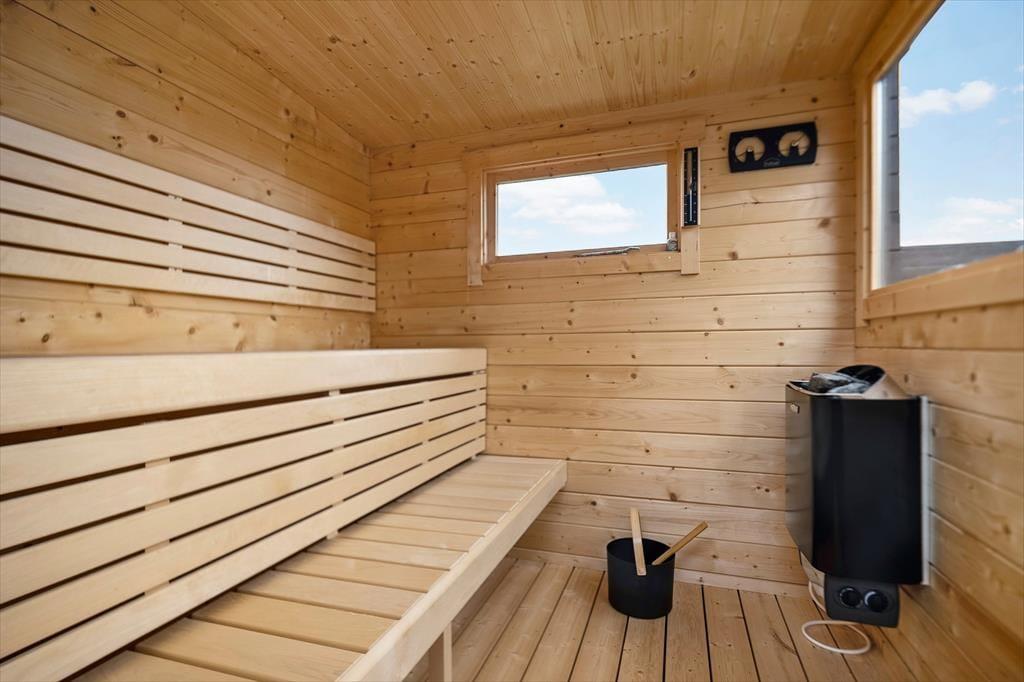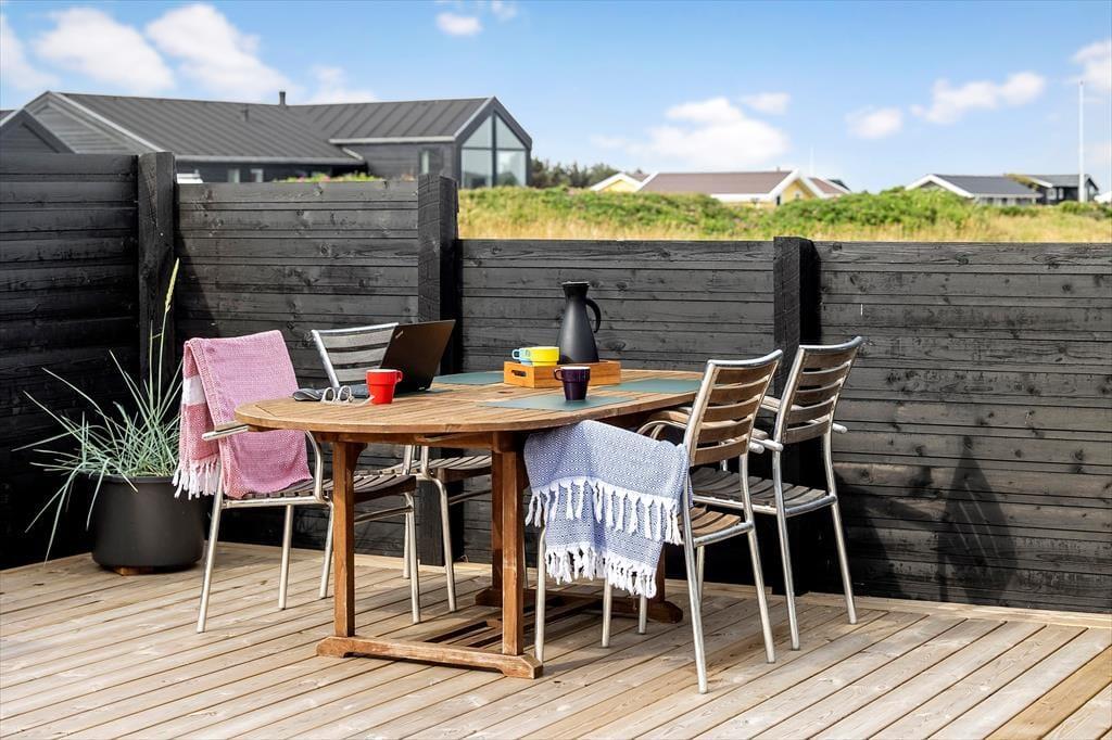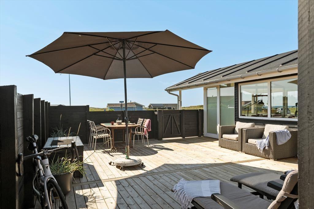 Udenfor på sommerhusets grund kan du virkelig mærke roen, der præger området. En stor terrasse indbyder til afslapning, hvor du kan nyde en god bog i solens varme stråler eller lade tankerne vandre med udsigt til den smukke natur omkring huset. Et af sommerhusets helt særlige træk er den udendørs sauna, som giver dig mulighed for at forkæle dig selv med en wellnessoplevelse under åben himmel – perfekt efter en forfriskende dag på stranden. Og netop stranden er tæt på: Du kan nemt gå ned og mærke sandet mellem tæerne eller tage en dukkert i Vesterhavet, der er lige rundt om hjørnet.