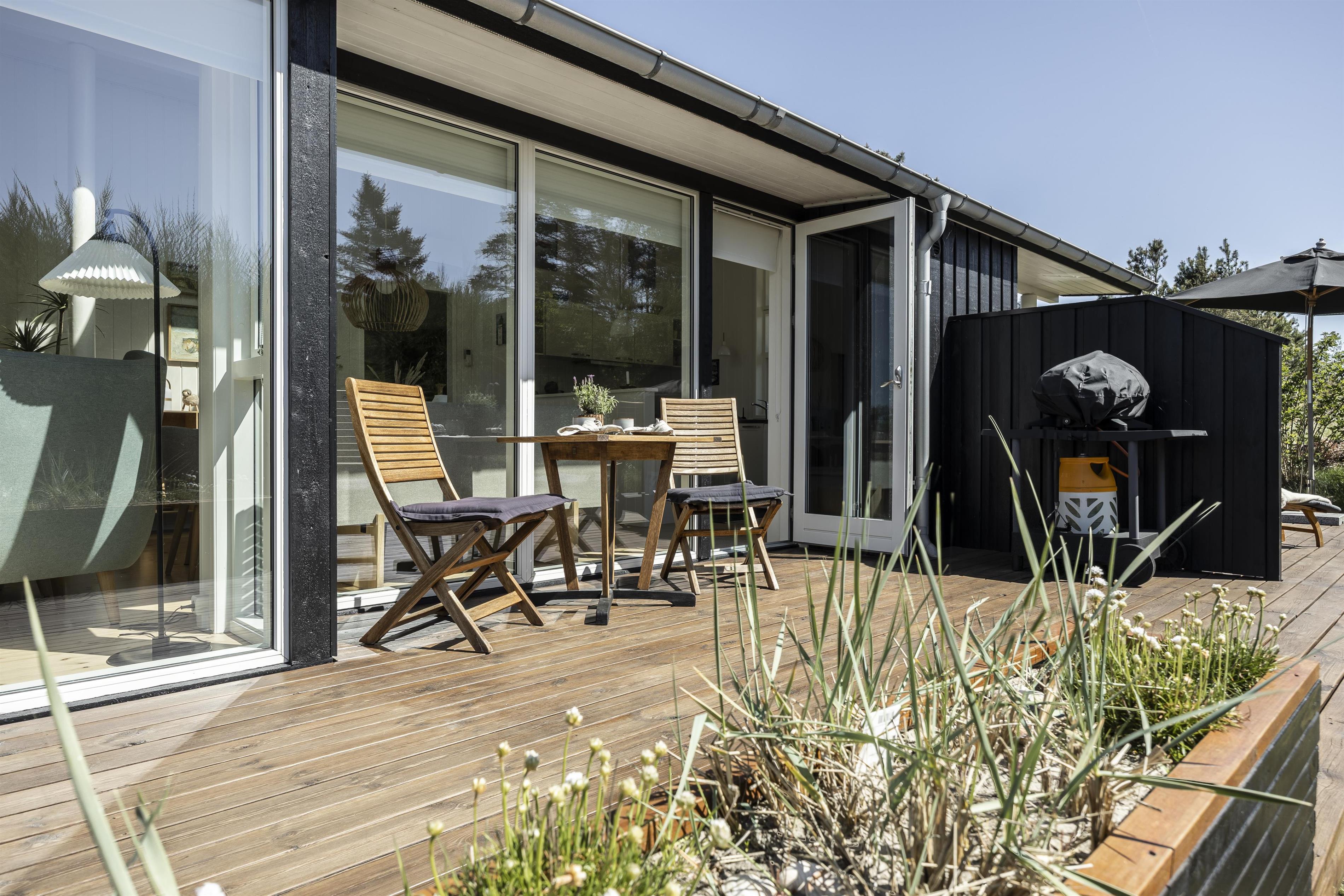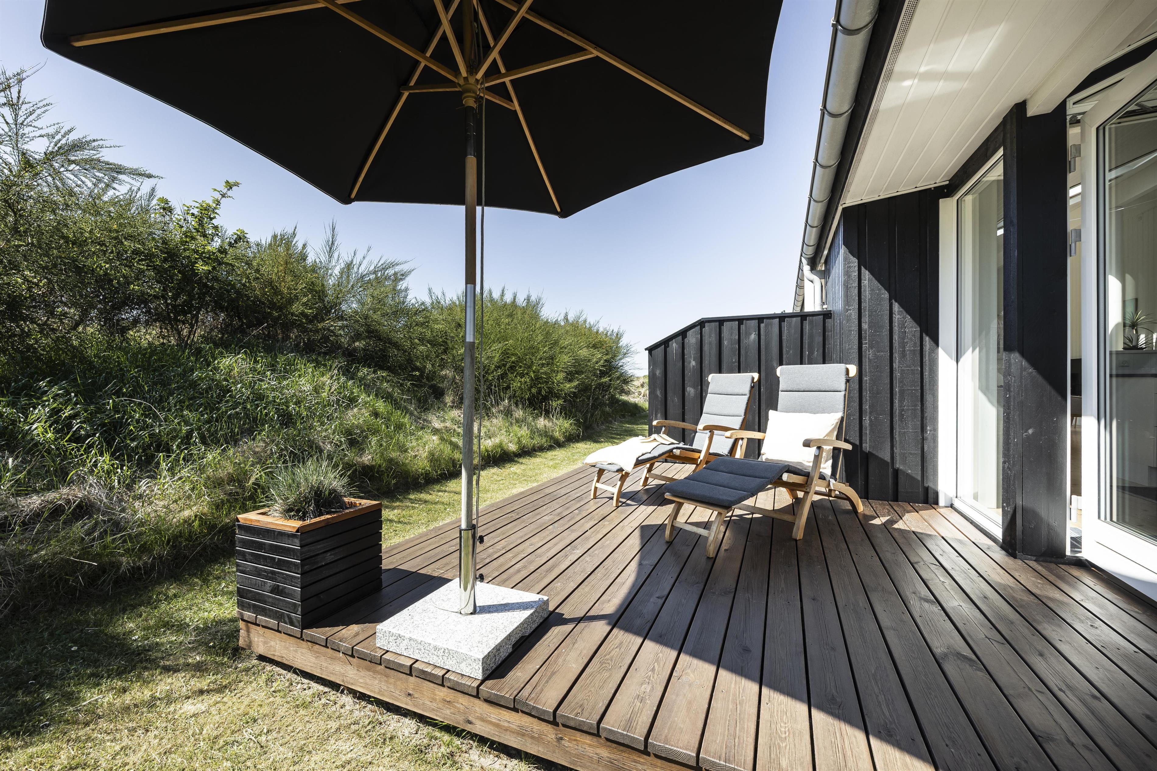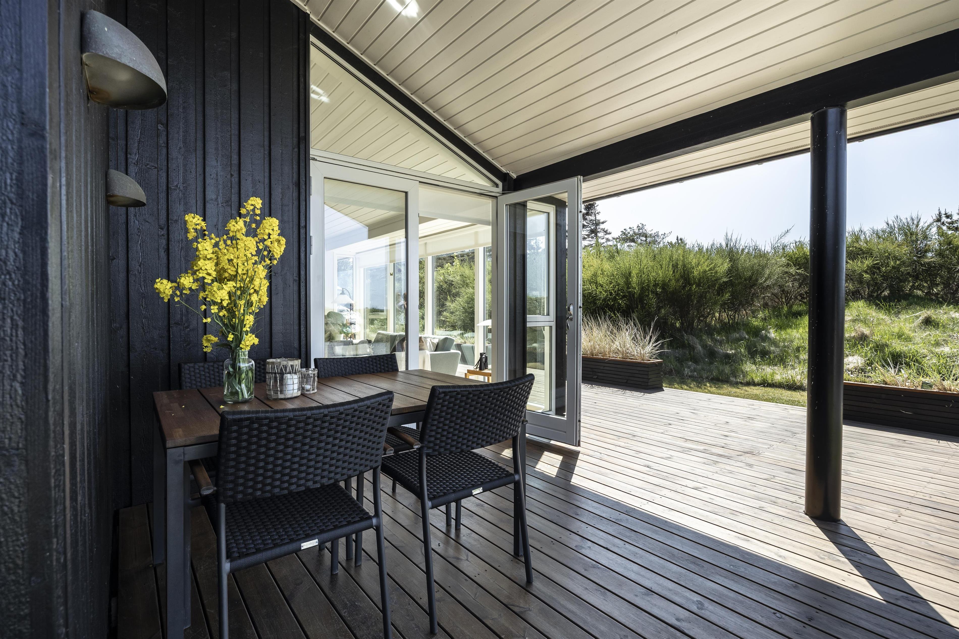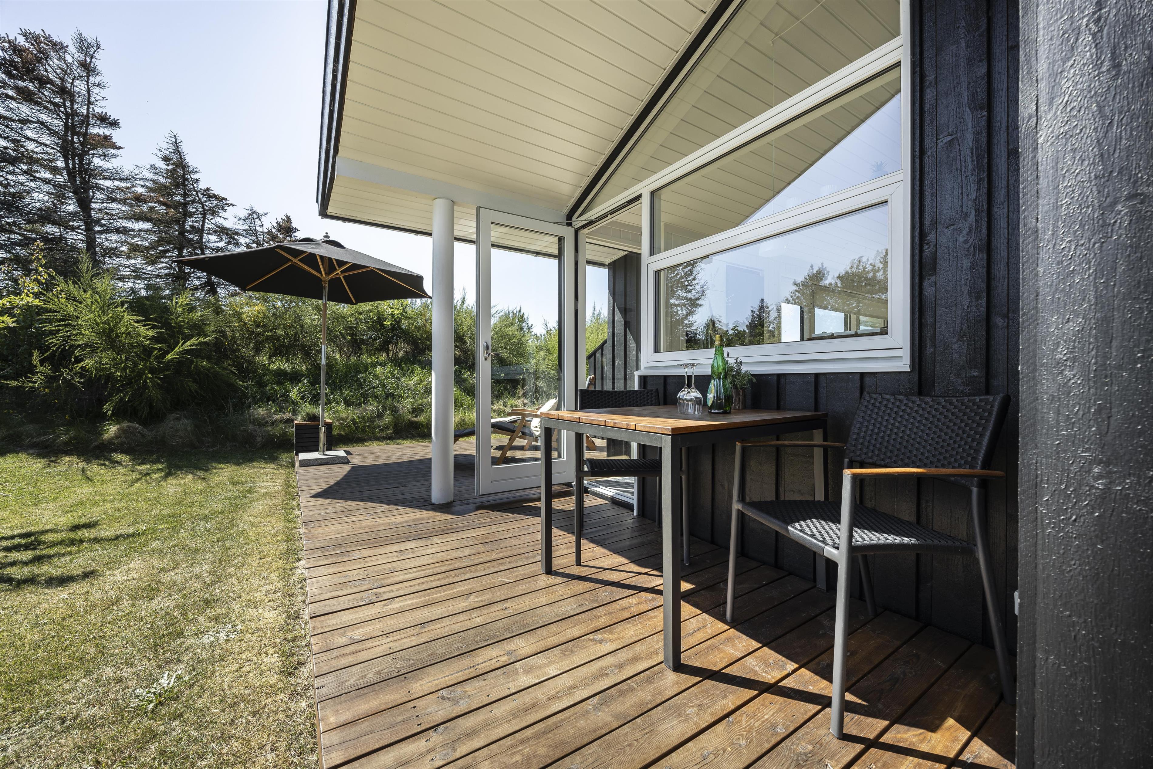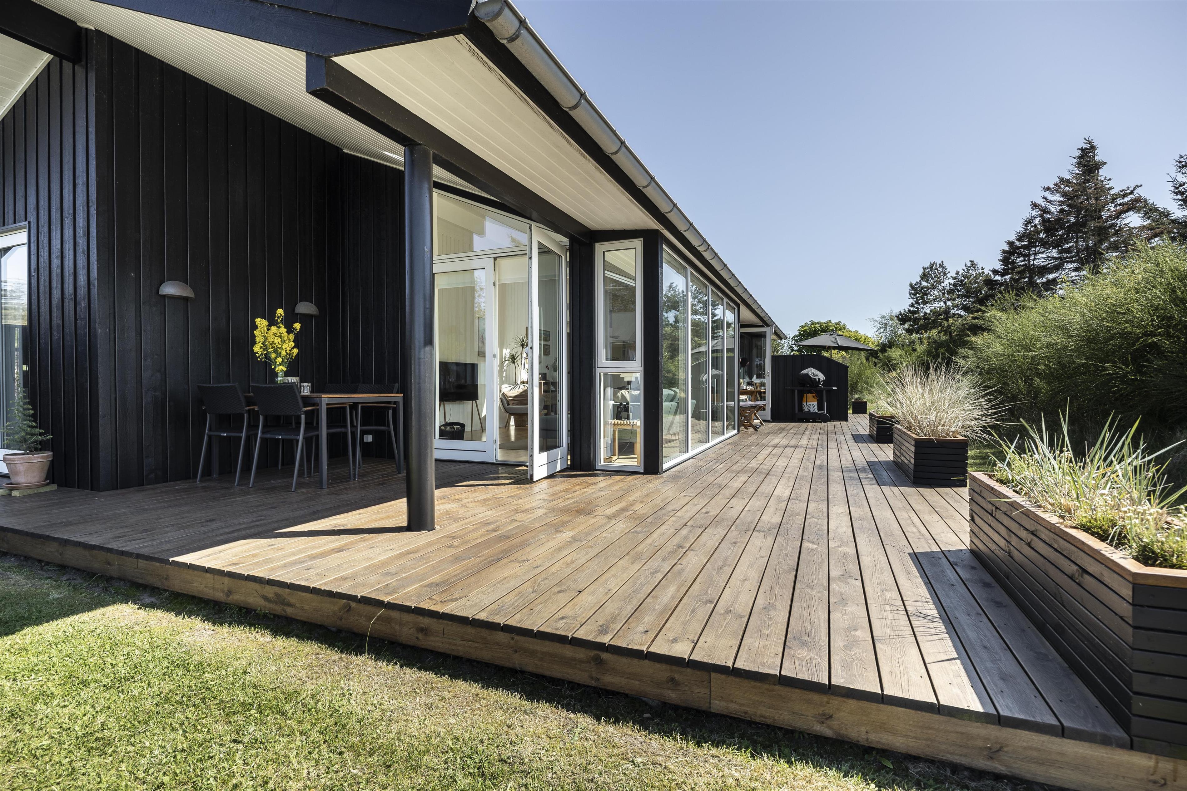 Den dejlige terrasse strækker sig hele vejen rundt om huset, så man har god mulighed for at følge solen hele dagen, eller hvis man har brug for at søge læ for den, til tider, barske vestenvind. Nyd en lækker grillaften på terrassen og slut dagen af med at se den flotte solnedgang fra terrassen mod vest. I begge ender af feriehuset finder I også en overdækket terrasse, som I kan trække ind under, når duggen begynder at falde.