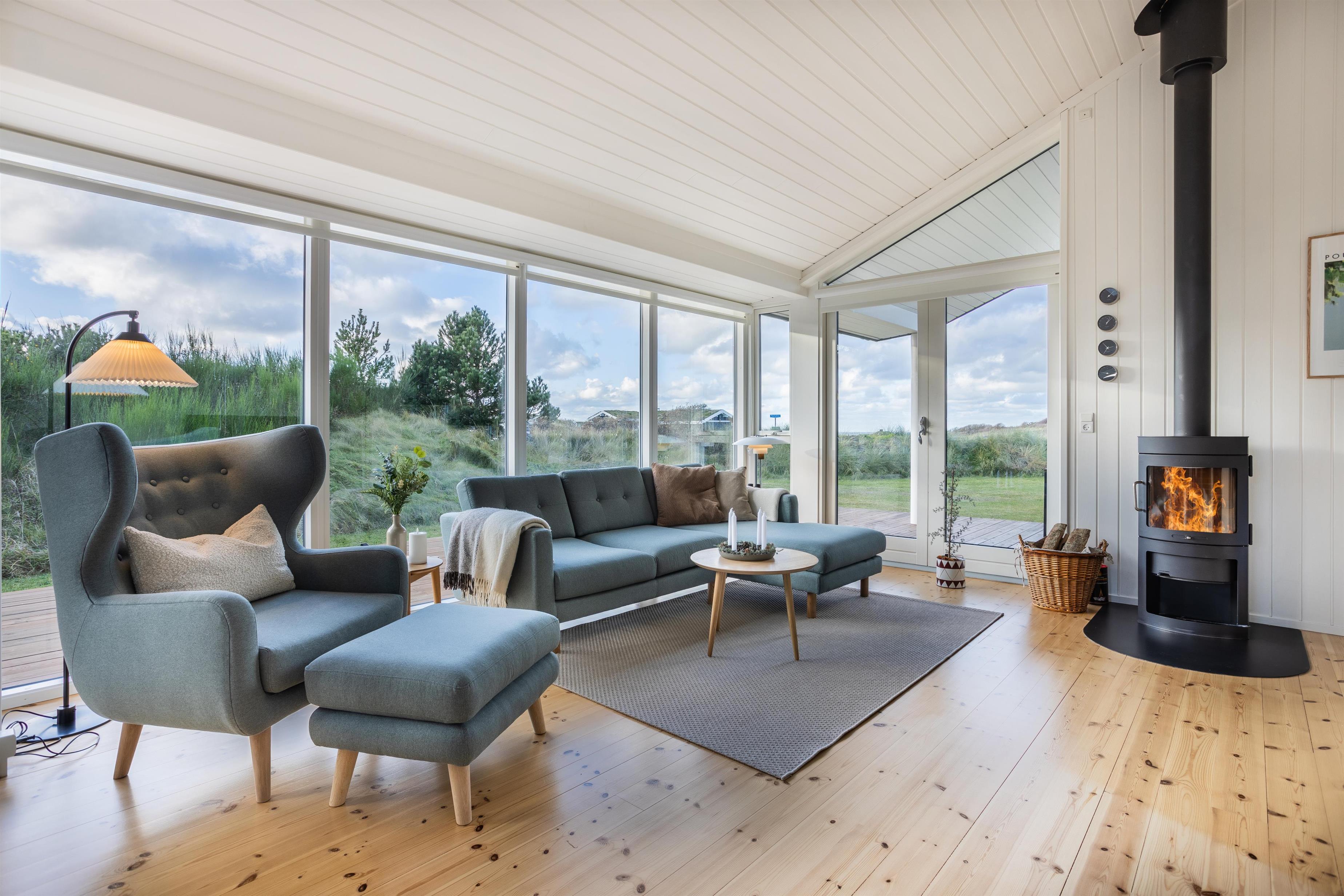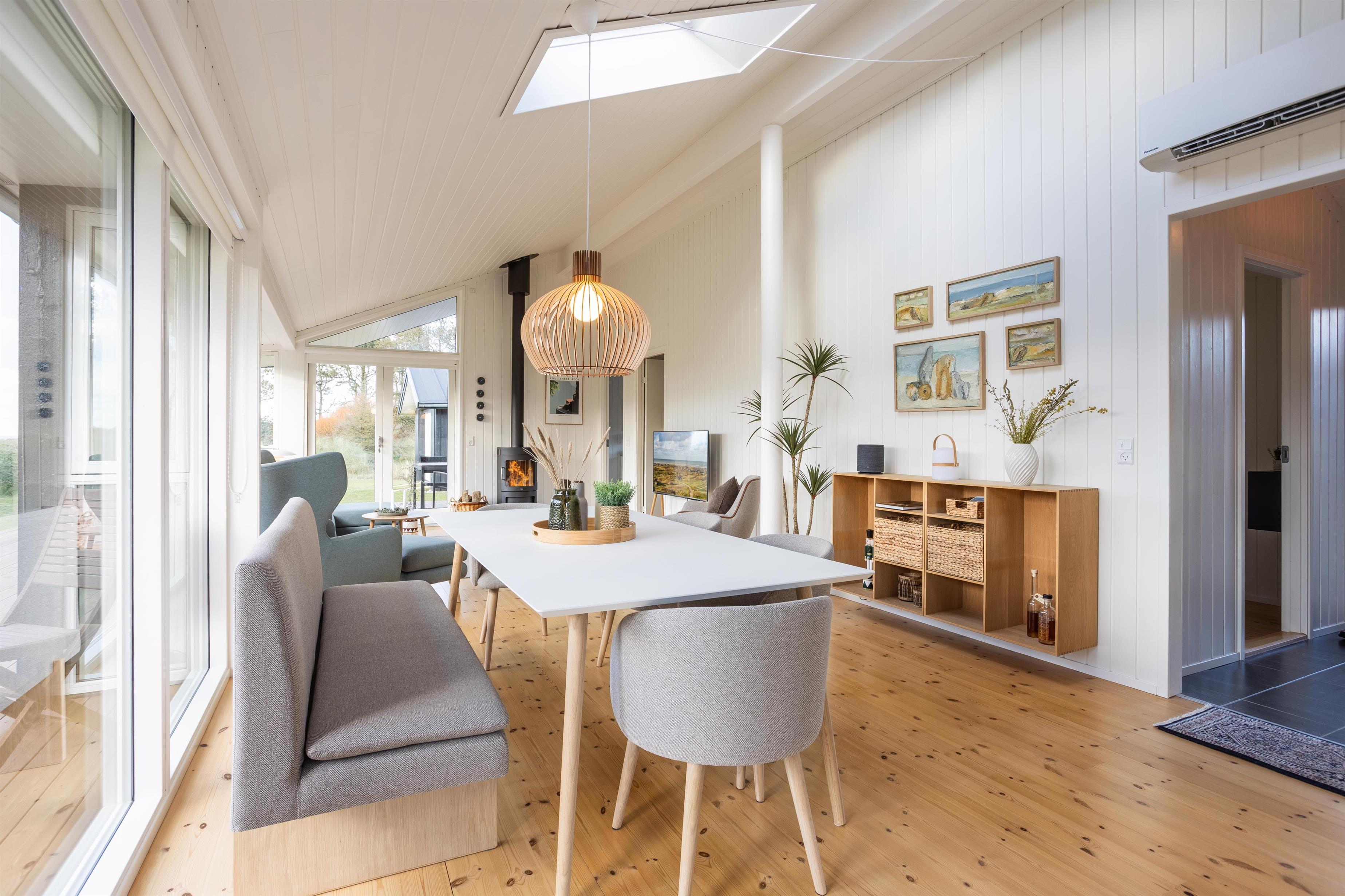 Huset er lyst og rummeligt med store vinduespartier, som inviterer naturen helt ind og skaber en harmonisk forbindelse mellem inde- og udemiljøet. Køkkenet, der er i åben forbindelse med spisepladsen og stuen, er veludstyret, og valget af møbler og materialer understøtter husets naturlige omgivelser. Stuen indbyder til hyggelige stunder med familie og venner – her kan I spille spil, se en god film eller nyde varmen fra brændeovnen på kølige aftener.
