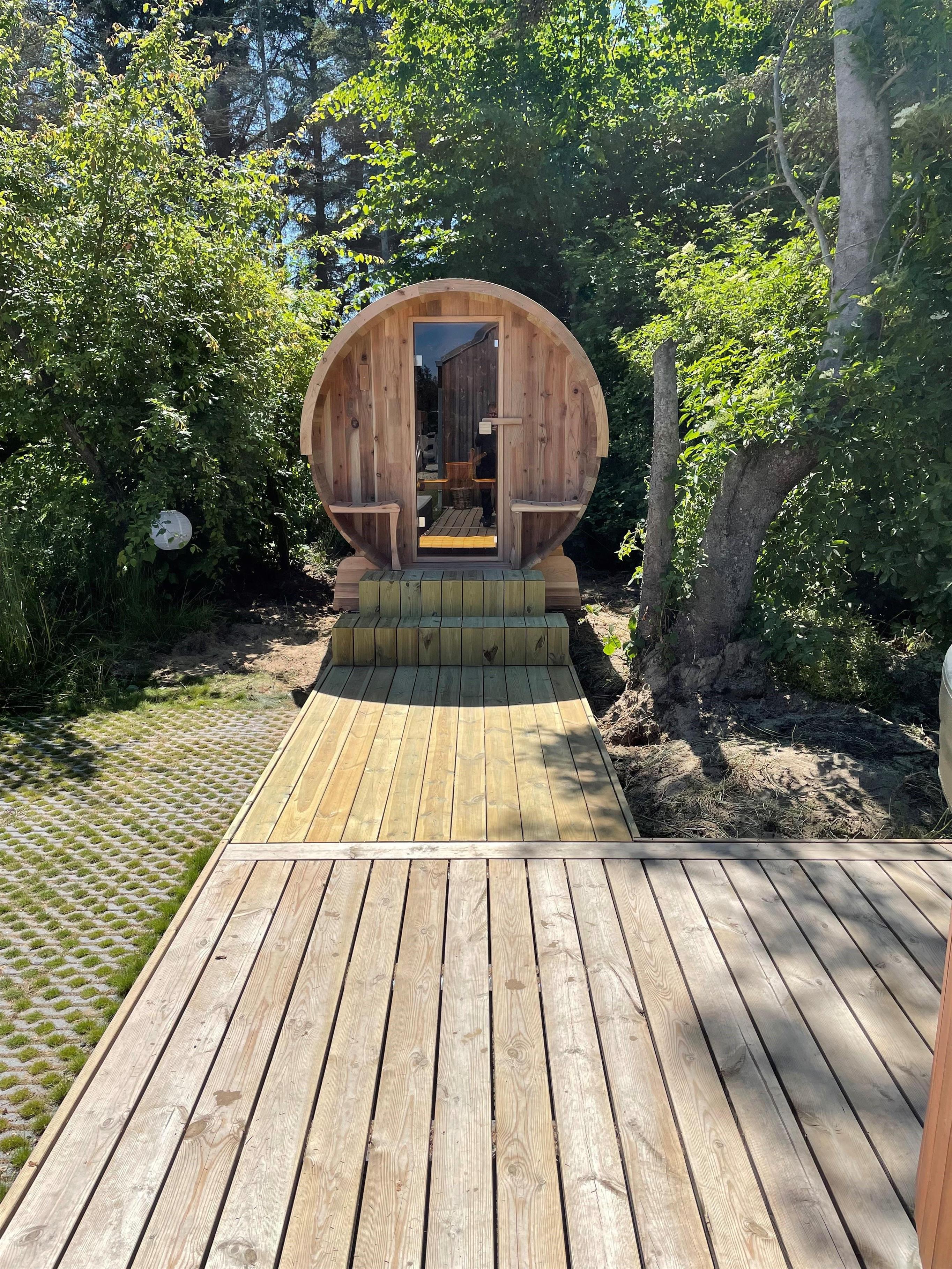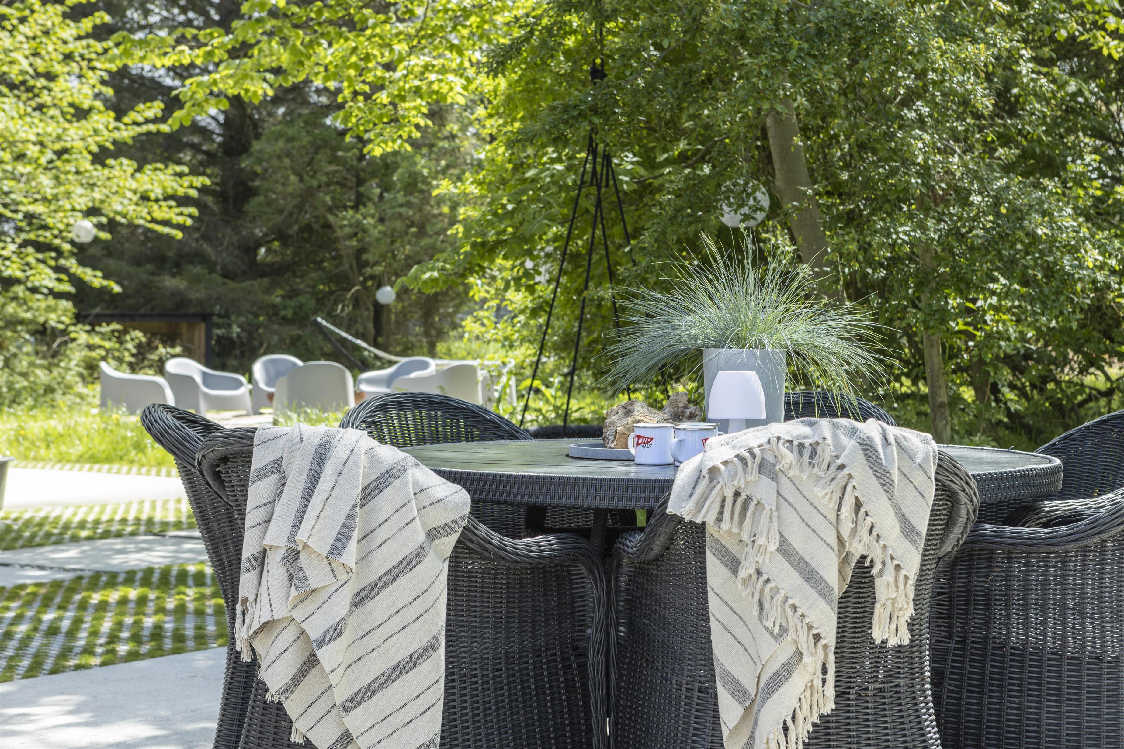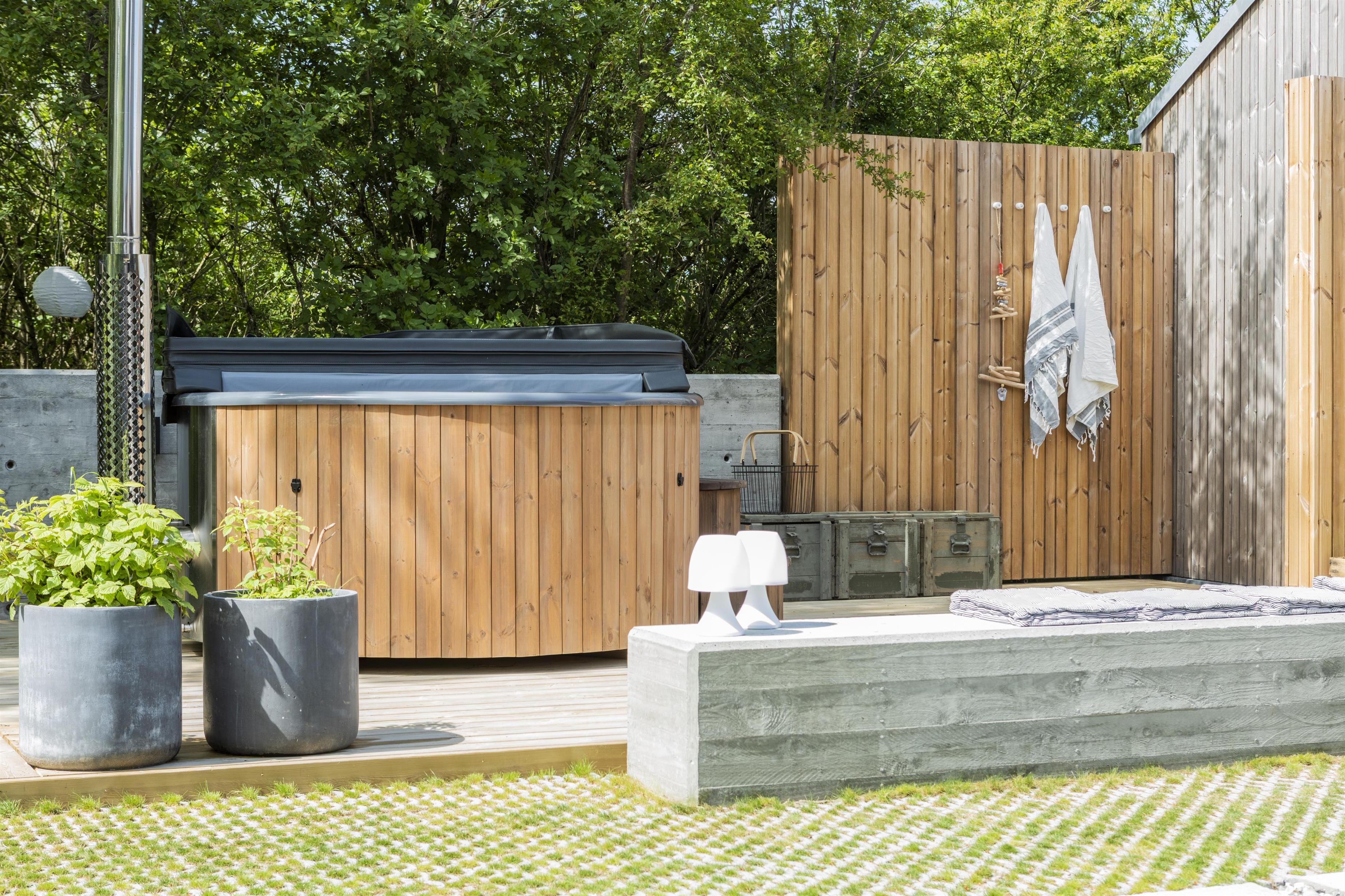 Fra begge stuer er der direkte udgang til en stor, privat terrasse, hvor I kan nyde roen og naturen. Her er der flere steder at slå sig ned og nyde den friske luft. Nyd en lækker grillaften på terrassen, lav et bål og rist skumfiduser eller læg jer til rette i liggestolene og nyd solen. På terrassen er der direkte adgang til vildmarksbadet og saunaen, og herfra kan I lade tankerne flyde, mens I fordyber jer i udsigten og nyder hinandens selskab.