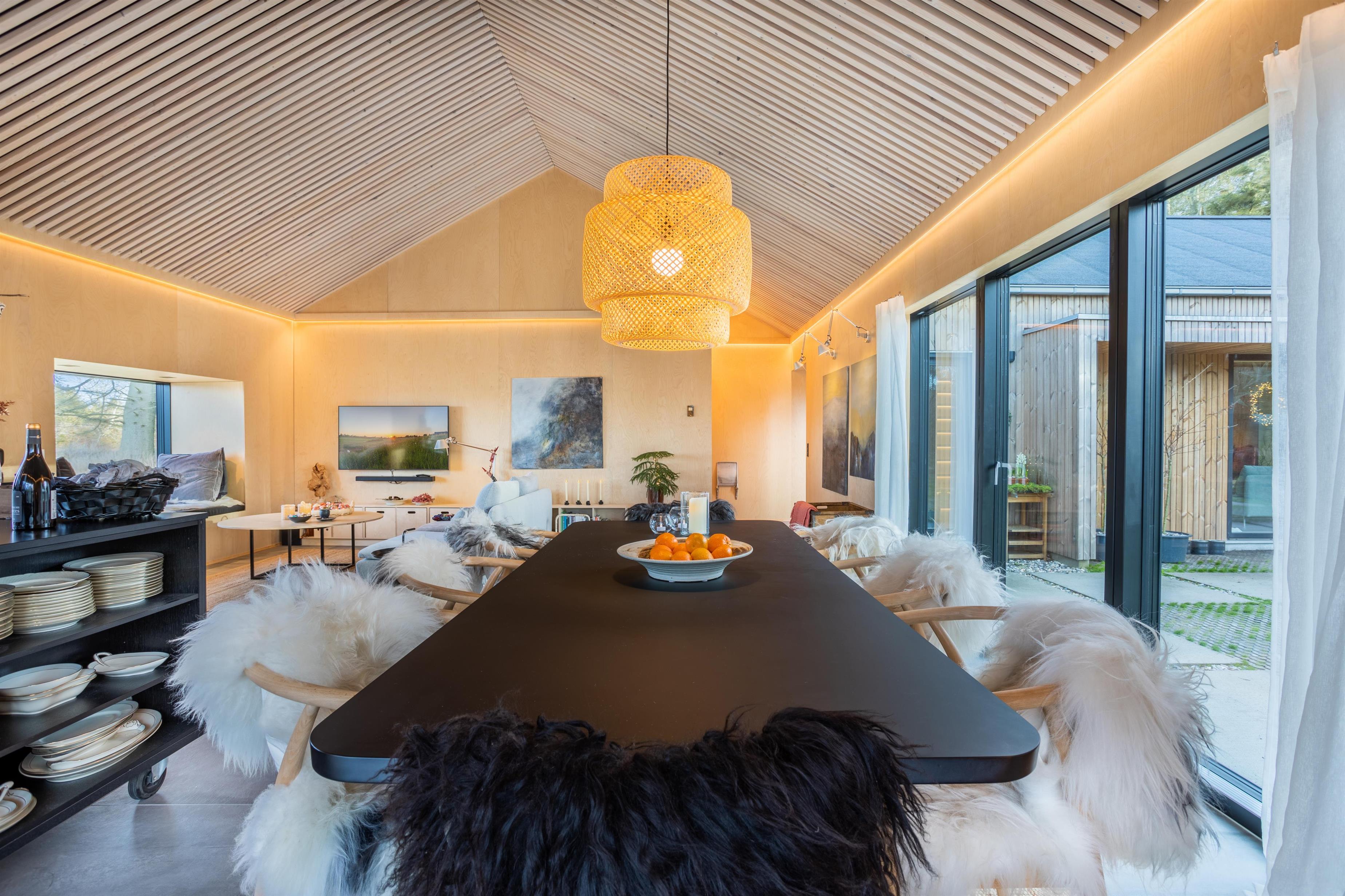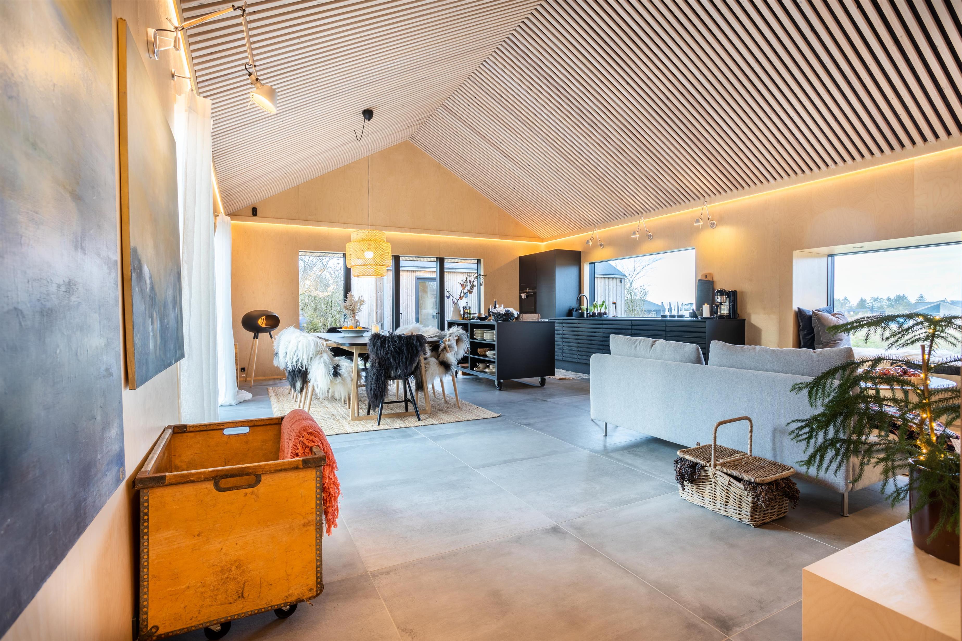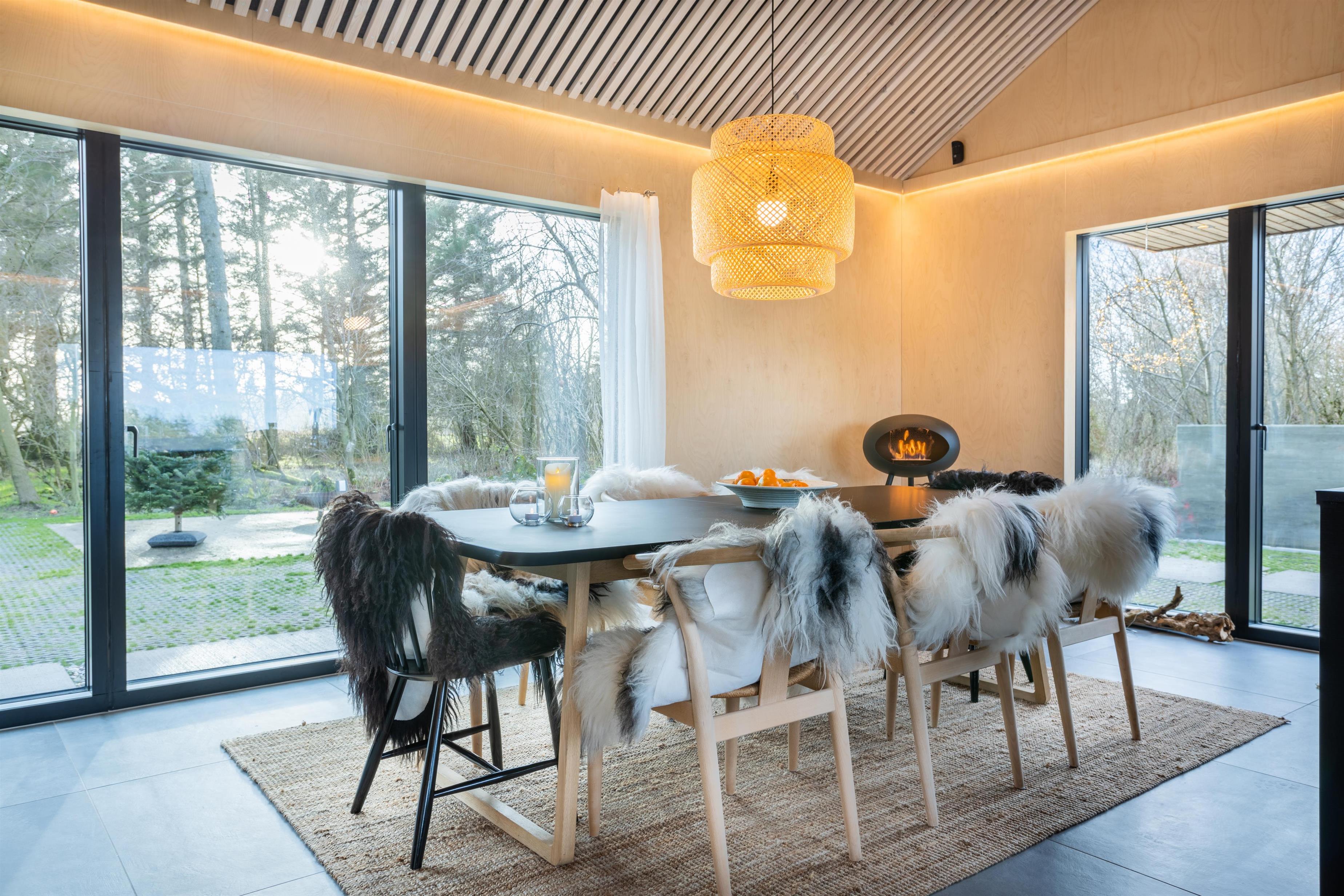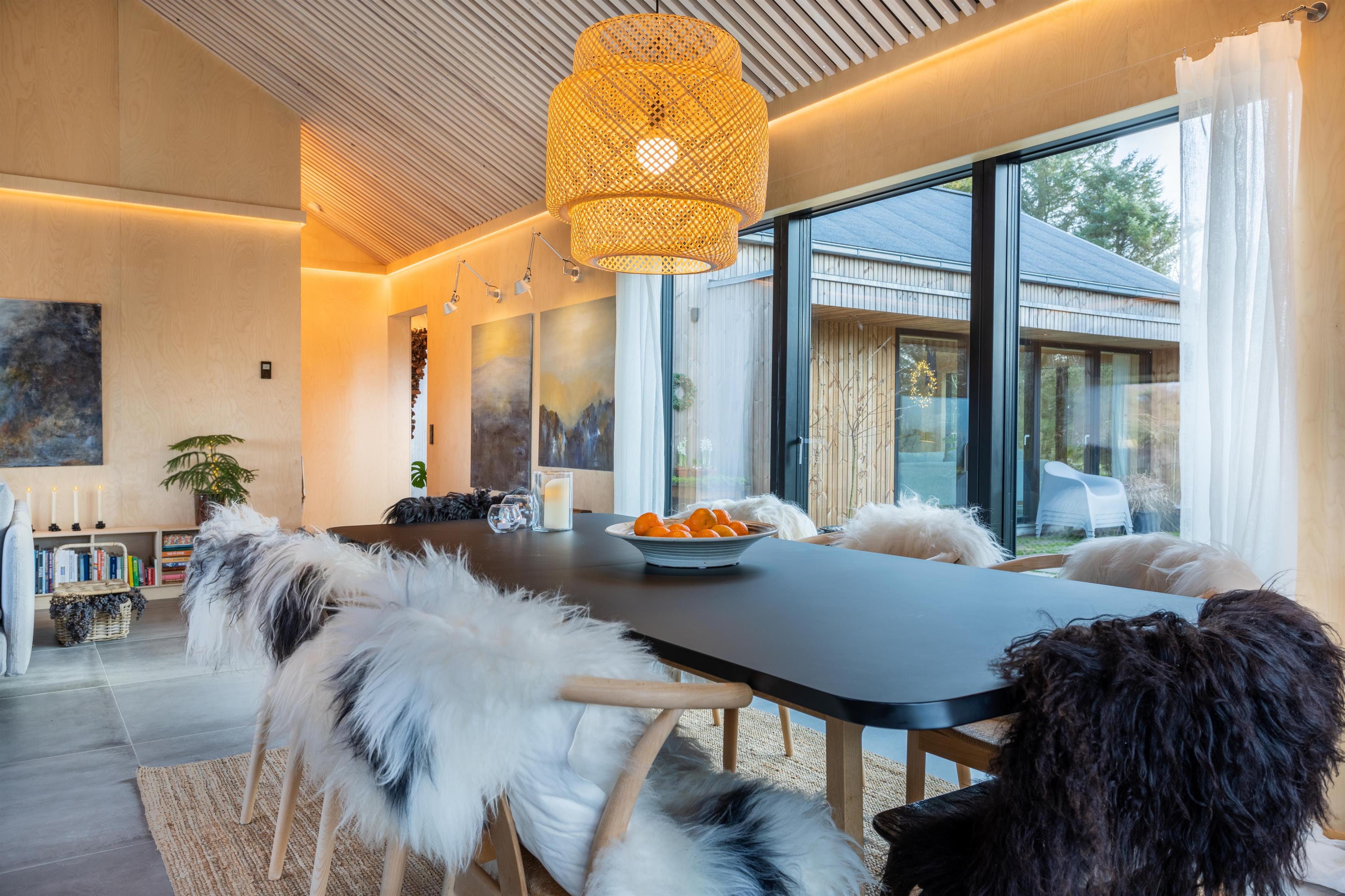 Med store gulv-til-loft-vinduer, der lader naturen og sollyset strømme ind, og loft til kip i det rummelige køkkenalrum, er der lagt op til afslapning og socialt samvær i lyse og indbydende omgivelser. Her kan I lade jer opsluge af udsigten, mens I tilbereder måltider, gå på opdagelse i husets mange spændende detaljer eller slappe af foran biopejsen med en god bog.