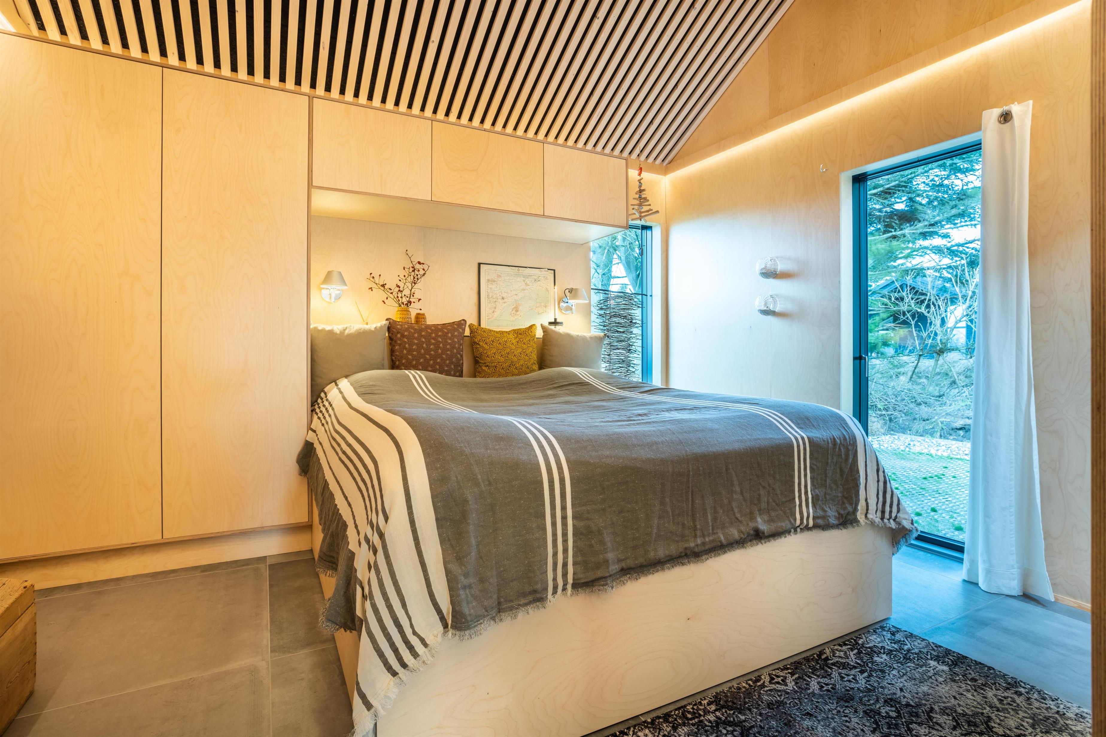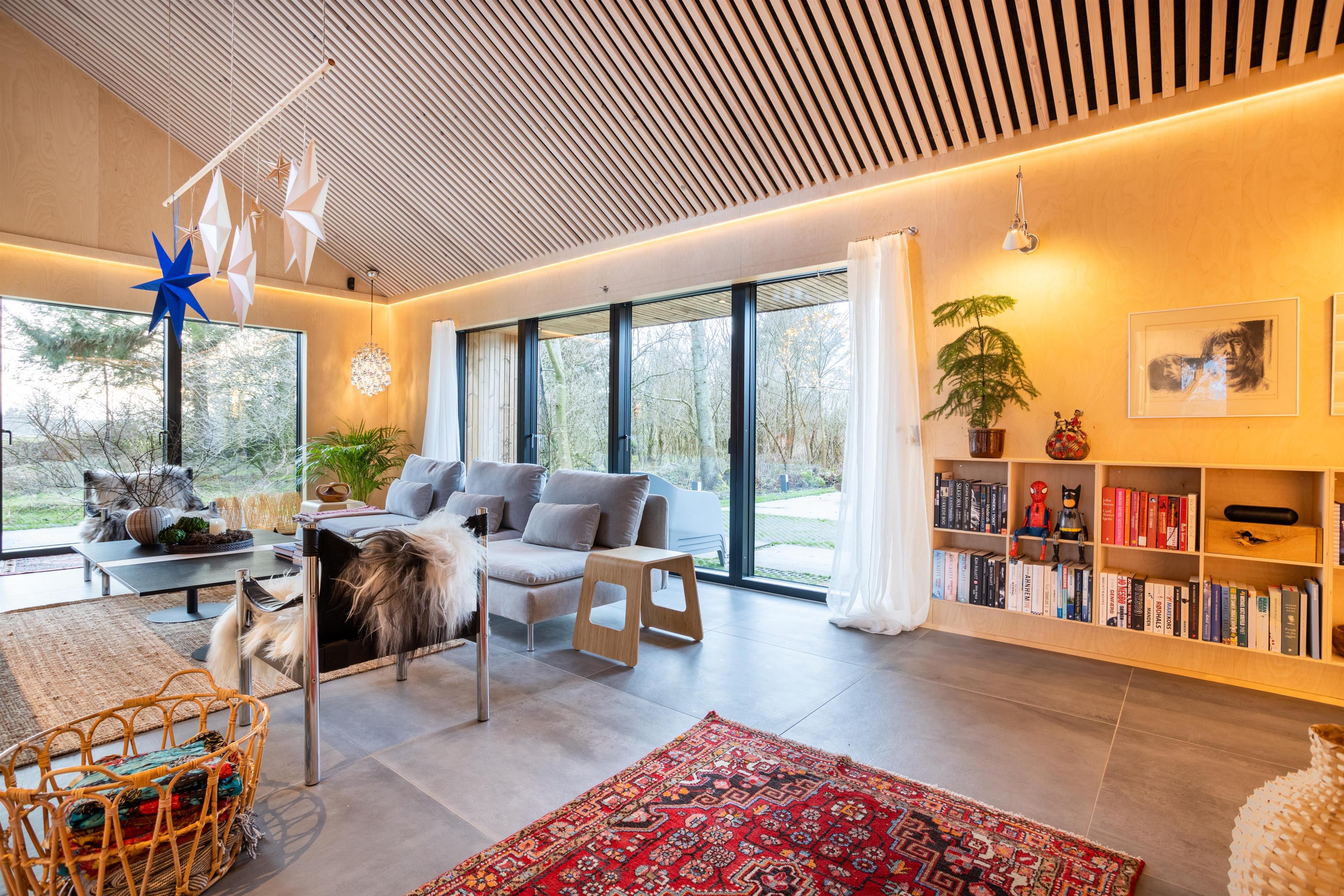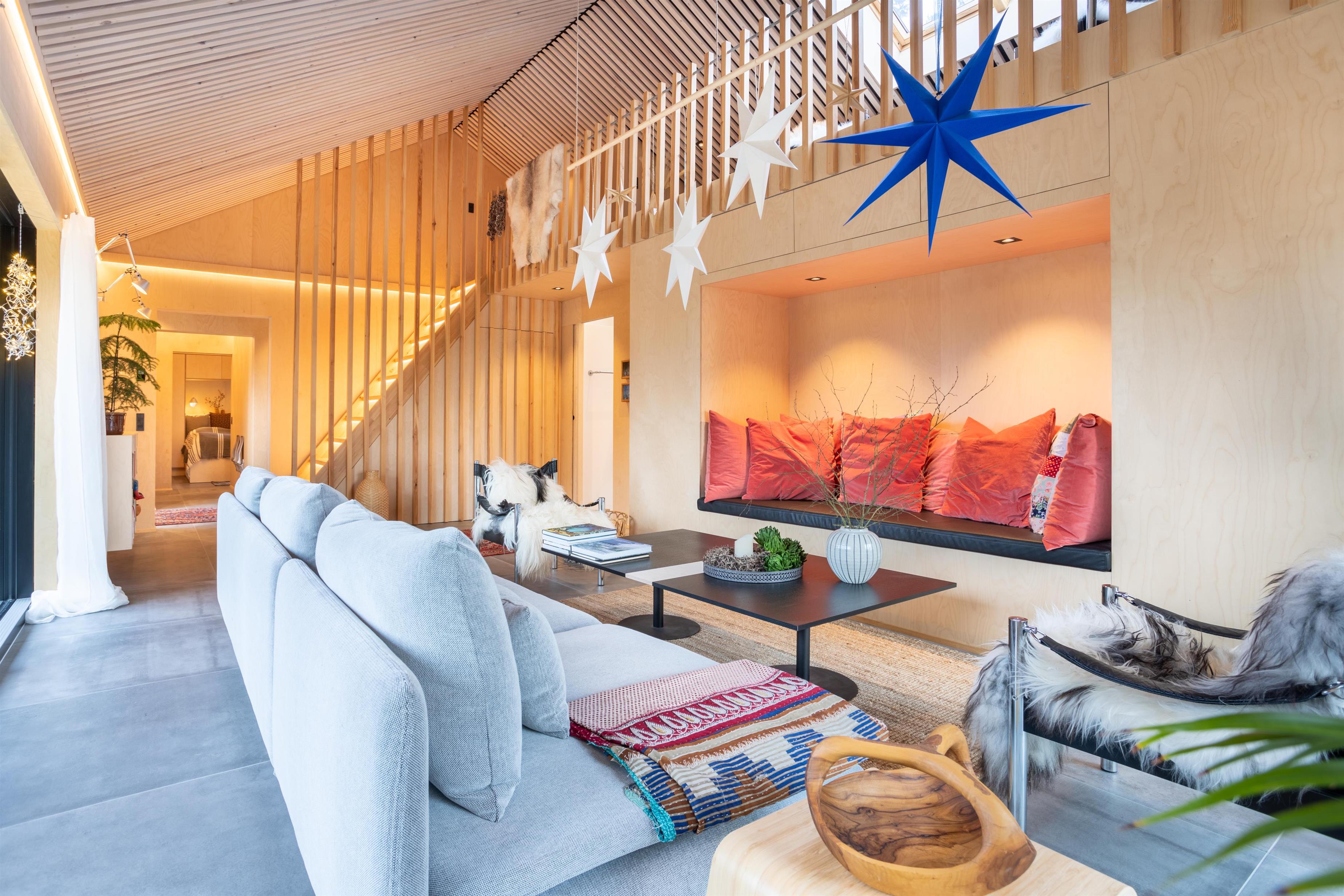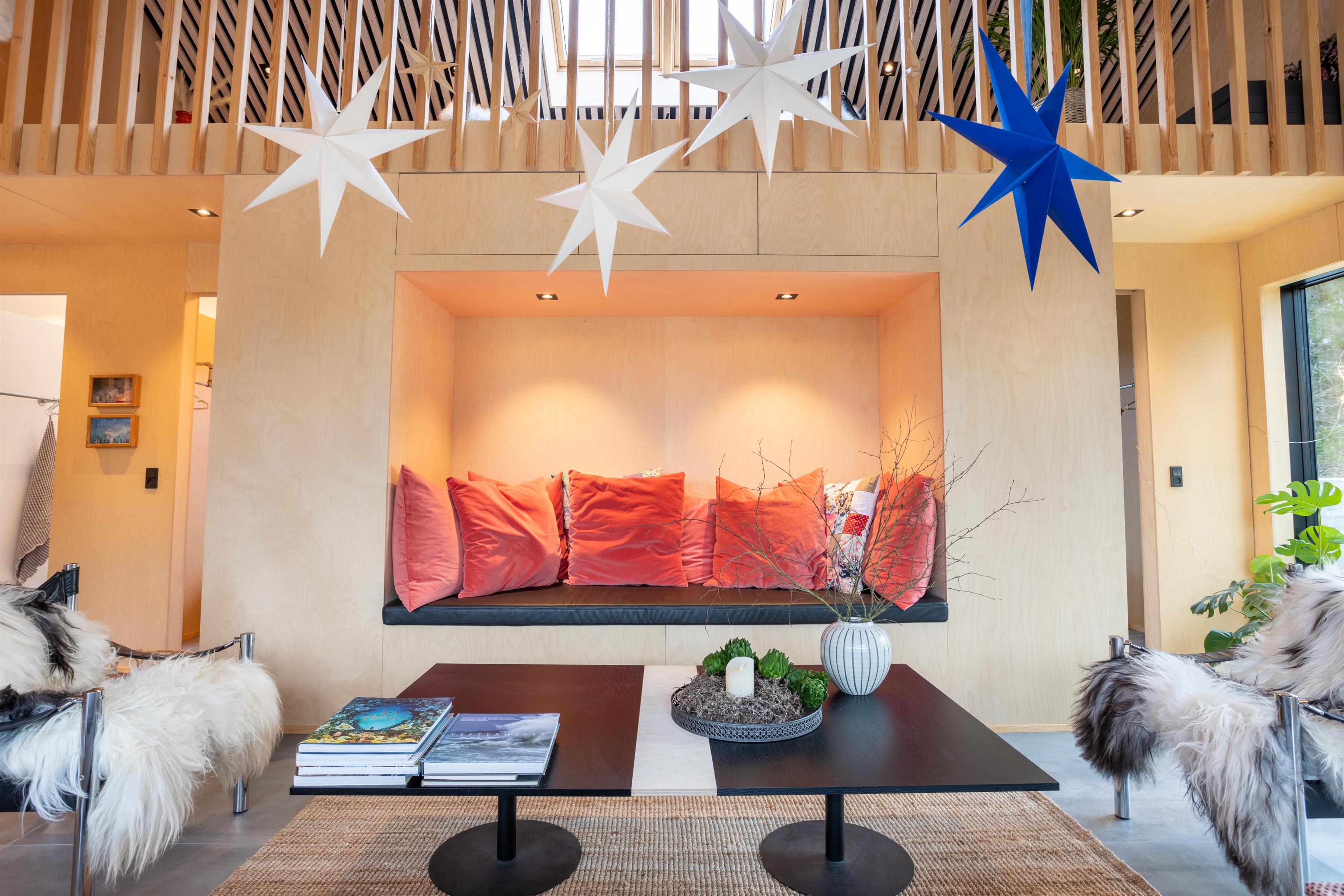 Med store gulv-til-loft-vinduer, der lader naturen og sollyset strømme ind, og loft til kip i det rummelige køkkenalrum, er der lagt op til afslapning og socialt samvær i lyse og indbydende omgivelser. Her kan I lade jer opsluge af udsigten, mens I tilbereder måltider, gå på opdagelse i husets mange spændende detaljer eller slappe af foran biopejsen med en god bog.