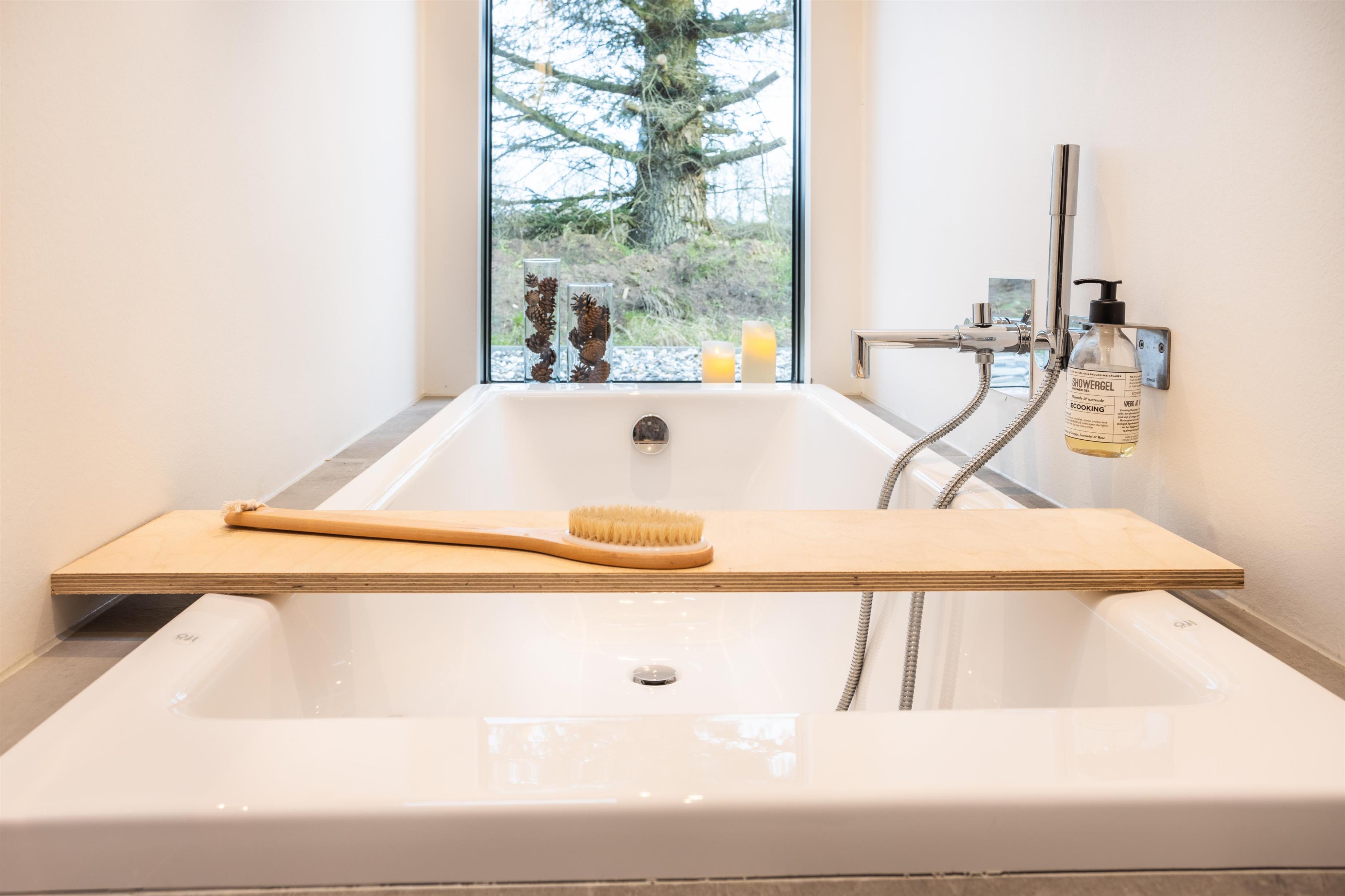 Feriehuset har tre gode soveværelser med plads til i alt 6 personer og to stilfulde badeværelser, hvoraf det ene er indrettet med et nedsunket badekar, som indbyder til afslapning med udsigt til naturen.