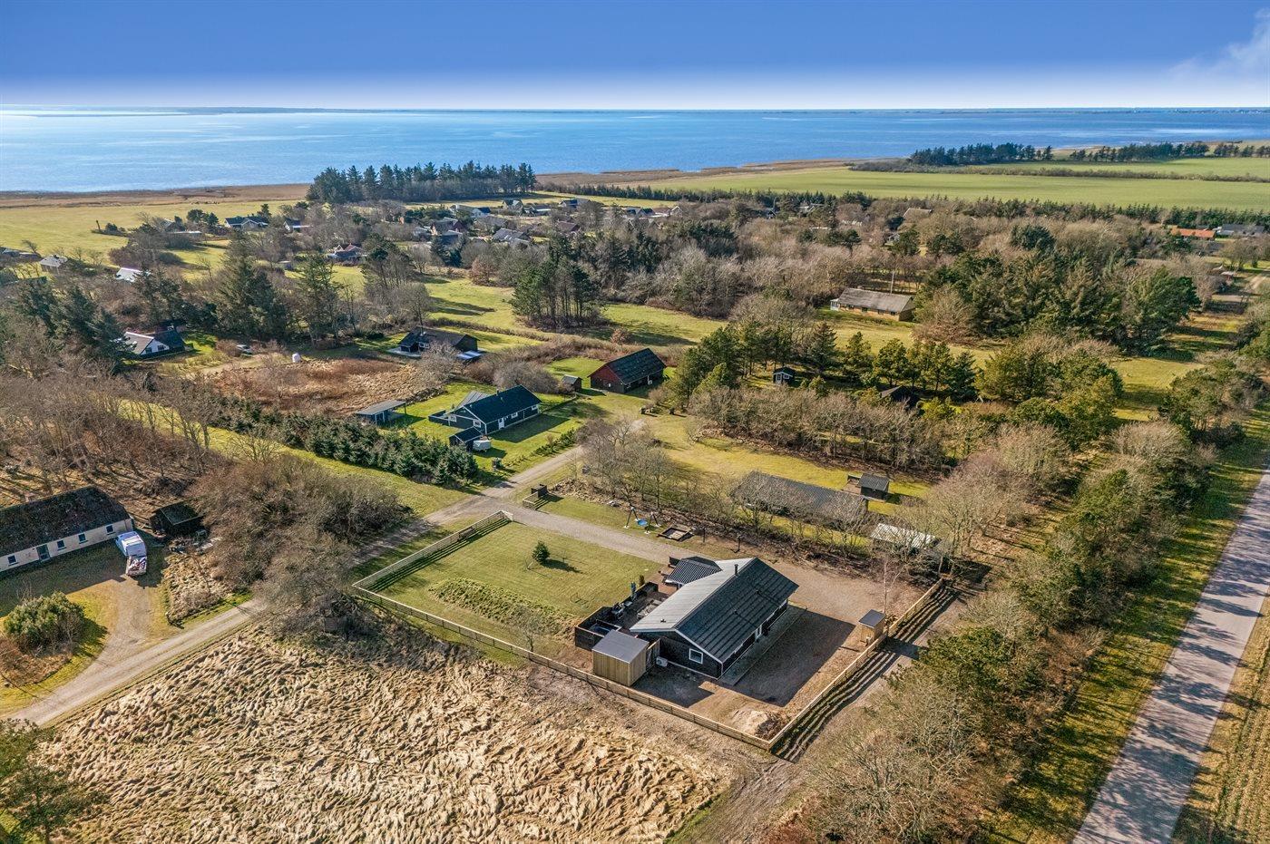 Ferieboligen er beliggende på en 1360 m² stor naturgrund. Grunden er indhegnet. Der er 400 m til fjorden. Nærmeste forretning er beliggende i en afstand af 9000 m. Til ferieboligen hører åbent terrasseareal. Gynge. Sandkasse. Udendørs sauna. Udendørs bruser. Grill til rådighed. Der er installeret stik til opladning af elbil. Type 2 stik. Med 9 kW ladeeffekt. Parkering ved ferieboligen.