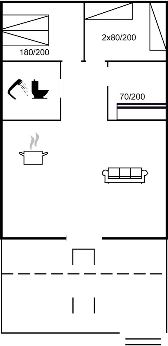 Der er i alt 3 soveværelser. Sovepladserne fordeler sig på: 2 sovepladser i dobbeltseng. 2 sovepladser i enkeltsenge. 2 sovepladser i køjeseng.