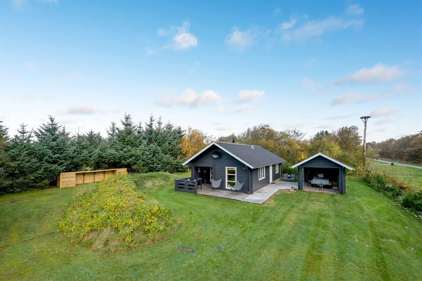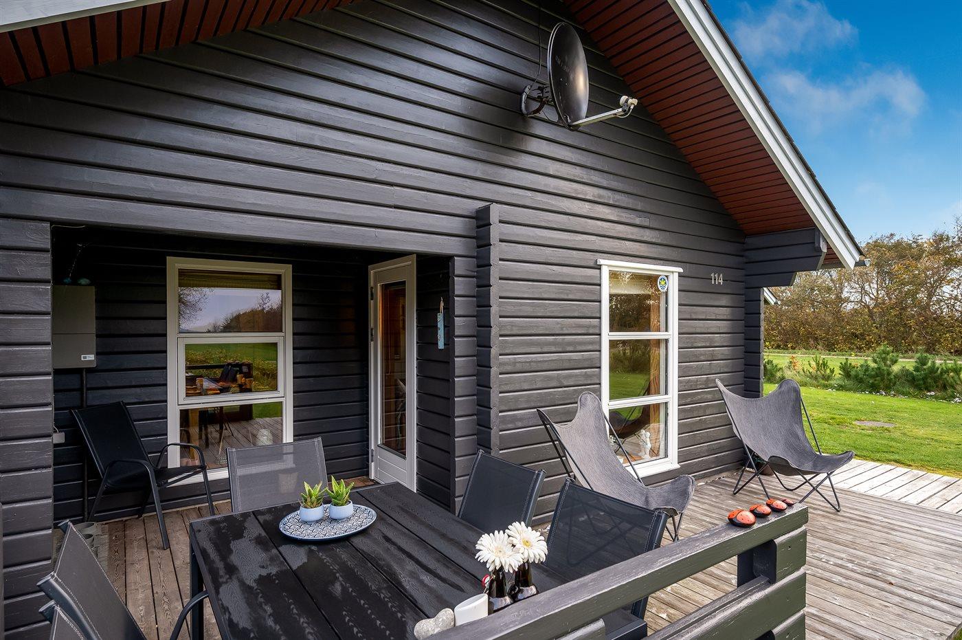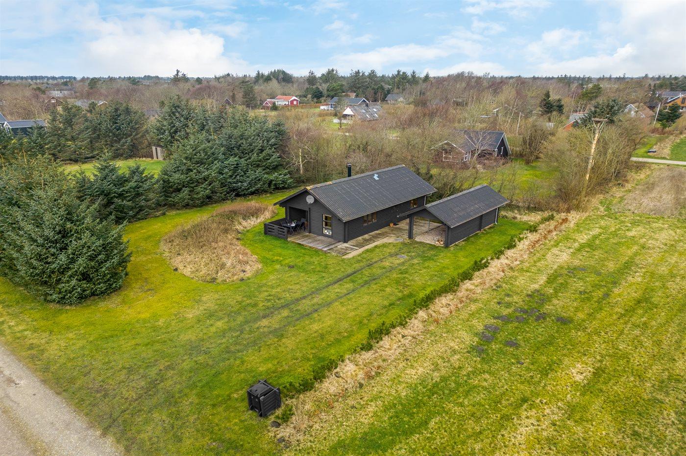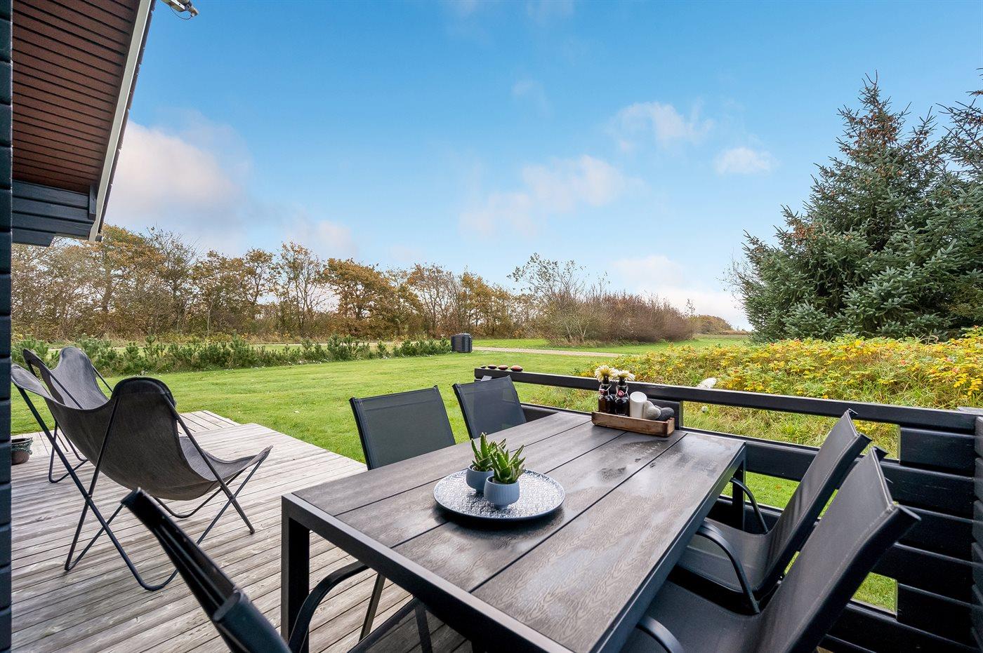 Der er træterrasse på øst-og sydsiden, for både morgen- og middagssol. Den hyggelige overdækkede terrasse vender mod syd, hvor den smukke udsigt og de dejlige aftentimer også kan nydes. Der er havemøbler; stole, bord, to liggestole, hynder samt parasol. Der er carport med plads til både bil og cykler.