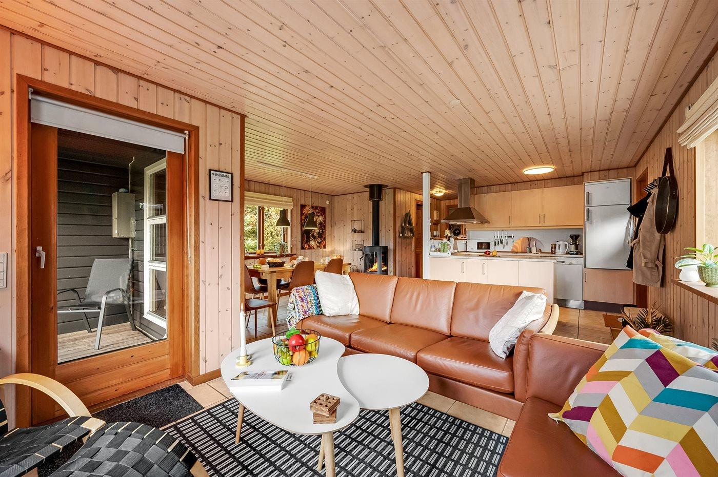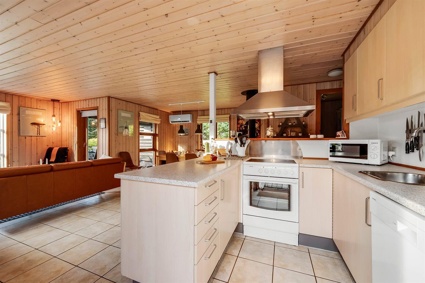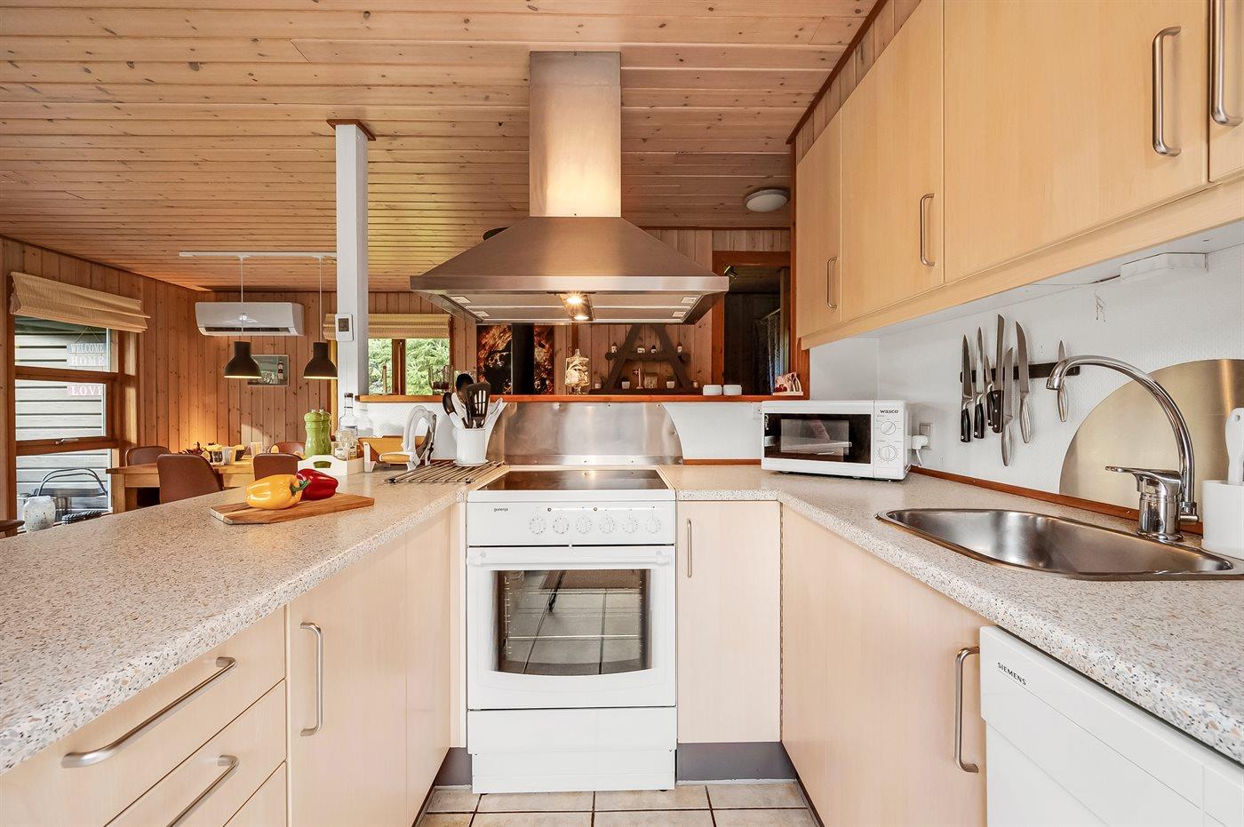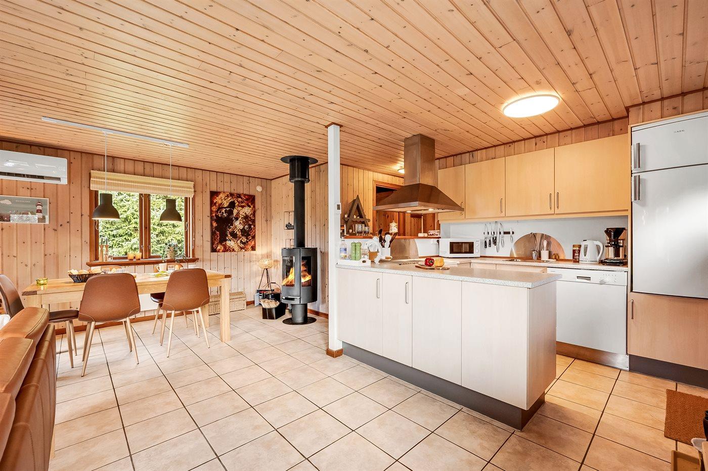 Det særdeles veludstyret køkken har god skabsplads, køle-/fryseskab, keramisk komfur med almindelig + varmluftsovn, mikrobølgeovn, emhætte og opvaskemaskine. Stuen, der er i åben forbindelse med køkkenet, har en hyggespredende brændeovn, der også alene kan varme hele huset op. Der er TV med parabol og chromecast, DVD-afspiller og stereoanlæg med CD-afspiller.